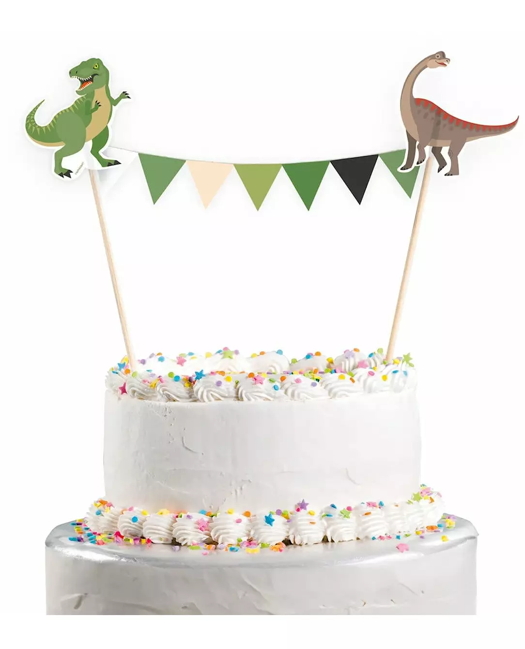 En dinosaurkake! Denne kakedekorasjonen består av to trehakker og en mini-girlander. Denne fine «kaketopperen» er ideell for å dekorere enhver kake. Du trenger bare å feste den på kaken din. Hver hakke representerer en dinosaur: en diplodokus og en t-rex. De to hakkene er forbundet med en girlander av hvite, grønne og blå vimpler. Denne dekorasjonen er perfekt for å pynte en kake til en bursdag med dinosaurtema! Inkludert tilbehør: 1 kakedekorasjon Materiale: Tre og papp Stell: Håndvask