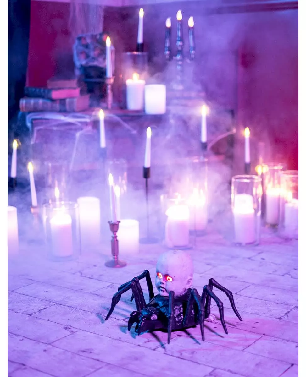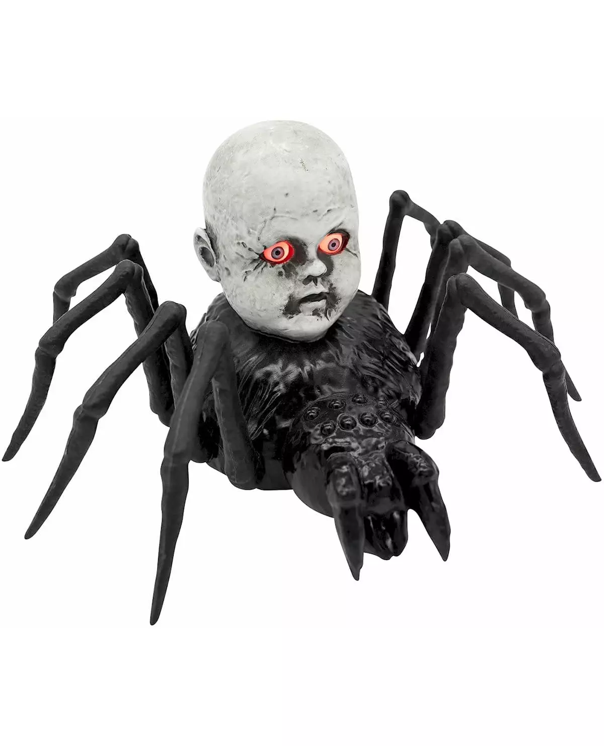 En skrekkelig baby! Denne dekorasjonen forestiller en animert krypende edderkoppdukke. Den måler omtrent 19 cm i høyden, 33 cm i bredden og 23 cm i dybden. Den er svart og hvit overalt, ledsaget av røde øyne! Edderkoppdukken vil starte når en høy lyd høres i nærheten (som klapping), og den mekaniske handlingen vil starte! Hun vil bevege seg rundt i rommet ditt, ledsaget av lyseffekter, spesielt med de røde øynene sine, mens hun slipper ut skremmende skrik! Denne edderkoppdukkedekorasjonen vil være ideell for å perfeksjonere stuen din under Halloween-festen din omgitt av vennene dine! Tilbehør inkludert: 1 animert edderkoppdukke Forsiktighet: Ikke vask