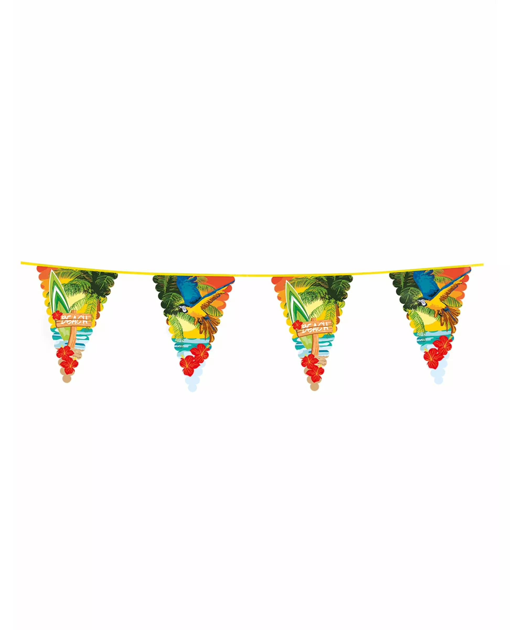 Store vimpler Denne «strandfest»-girlanderen består av en 6 meter lang gul plastsnor dekorert med store vimpler som måler 46 cm i høyden og 30 cm i bredden. Laget av tynn, fleksibel plast, vil disse vimplene bevege seg jevnt i vinden. Viktig for en luftig hawaiisk-, strand- og sommerdekorasjon. Inkludert tilbehør: girlander Materiale: Plast