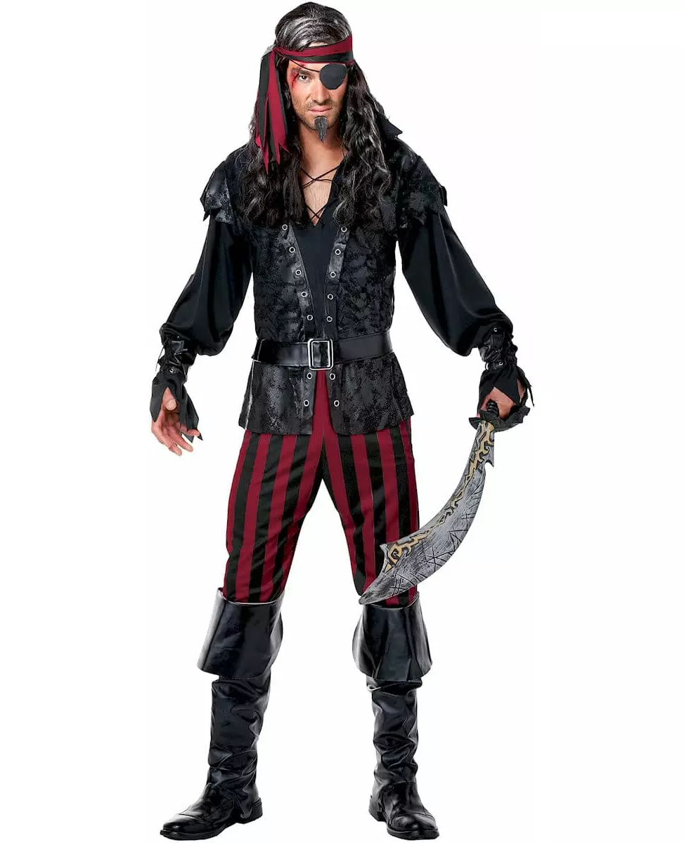 Vær nådeløs! Dette piratkostymet for menn består av en langermet topp, capribukser, to mansjetter, et belte, to støveltrekk og et pannebånd (sabel og øyelapp er ikke inkludert). Den svarte langermede toppen har en vest i kunstskinn med bånd i kunstskinn med maljer. Capribuksene er røde og svarte striper. Midjen er elastikk for bedre passform. Mansjettene er i svart kunstskinn. De kan justeres med en snor som går gjennom maljene. Det justerbare svarte beltet har en sølvfarget plastspenne. Støveltrekkene med læreffekt er svarte og holder seg på plass takket være en elastikk som går under foten. Pannebåndet som du knyter rundt hodet matcher capribuksene. Dette piratkostymet vil være perfekt for en temafest eller karneval. Inkludert tilbehør: Topp, capribukser, to mansjetter, belte, pannebånd, to støveltrekk. Materiale: 100 % polyester. Vedlikehold: Håndvask.