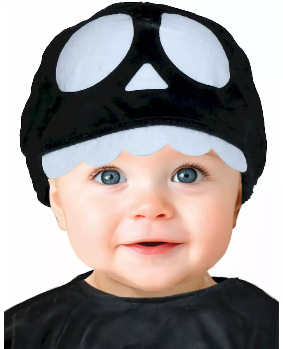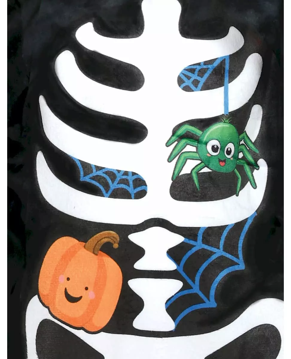 Søtt skjelett til Halloween! Dette skjelettkostymet til babyen består av en jumpsuit og et matchende hodeplagg. Jumpsuiten med langermet trykk er svart med et hvitt skjeletttrykk. De trykte beinene på antrekket er forbedret med søte små detaljer som et smilende gresskar og en grønn edderkopp i nettet sitt, noe som gir et morsomt og fargerikt preg. Det svarte hodeplagget fullfører antrekket perfekt med et hvitt hodeskalledesign. Med dette skjelettkostymet blir barnet ditt det søteste lille skjelettet, klart til å glede alle på neste Halloween-fest! Inkludert tilbehør: 1 jumpsuit 1 hodeplagg Materiale: 100 % polyester Vedlikehold: Håndvask