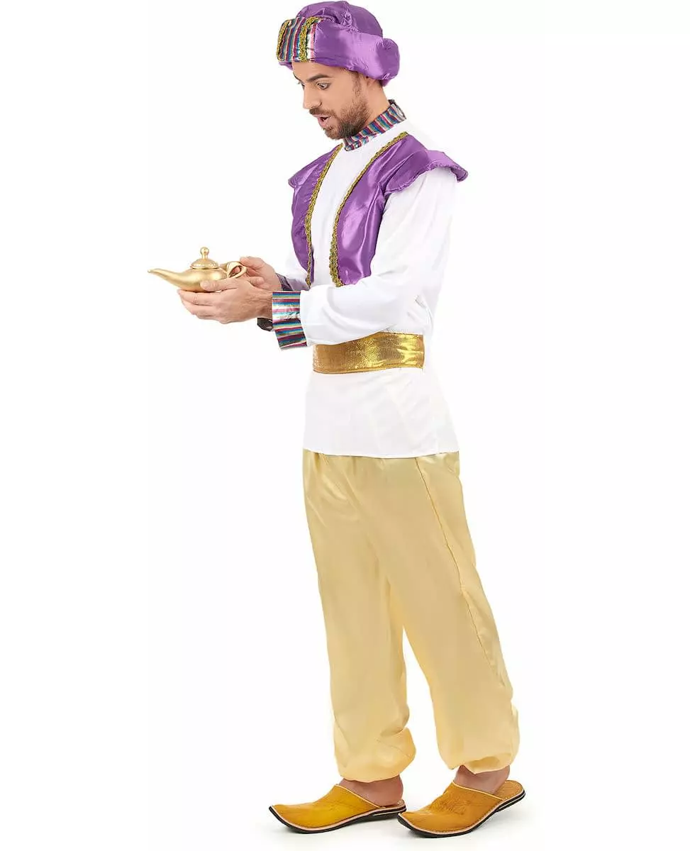 Strålende kostyme! Dette sultankostymet for menn inkluderer en topp med vest, bukser, belte og hatt (tøffel og lampe er ikke inkludert). Toppen er hvit med lange ermer. Kragen og ermene er dekorert med stoff med skinnende flerfargede striper. Sydd foran fullfører en lilla satengvest med gullkant ditt orientalske prinselook perfekt. Baggy bukser med elastisk linning gir en haremseffekt. Stoffet er lysegul sateng. Midjen din vil fremheves takket være et bredt gullfarget stoffbelte som knytes bak. Til slutt, hva ville et sultankostyme være uten et hodeplagg? Dette er laget av lilla stoff polstret med skum. Det passer til hodestørrelser rundt 56 cm. Fly av gårde til landet Tusen og én natt med dette ganske komplette sultankostymet! Inkludert tilbehør: T-skjorte med falsk vest Bukser Belte Hatt Materiale: 100 % polyester Vedlikehold: Håndvask