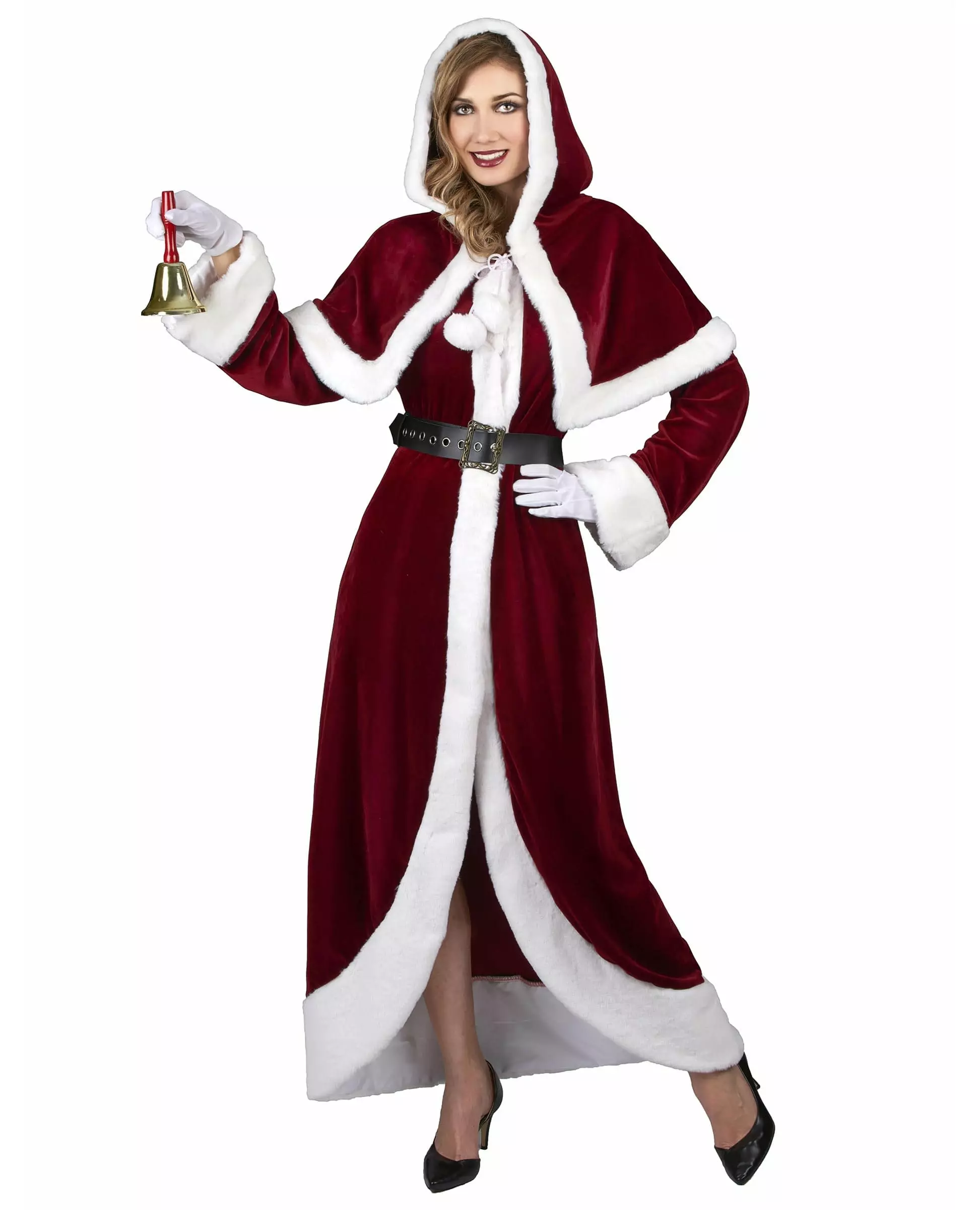Veldig pent pyntet, selv i forkledning! Dette fantastiske Julenissen-kostymet er for kvinner og inkluderer en kjole, et belte og en kappe med hette. (Hansker, sko og bjelle er ikke inkludert). Stoffet er av svært høy kvalitet, det myke er smidig, tykt og ekstremt mykt. Den intense røde fargen er mørk og har vakre refleksjoner. Kjolen strammes i midjen takket være det svarte beltet i imitert skinn og metallspennen. Den todelte kjolen lukkes foran med metallknapper. Kappen knytes foran med to snorer og hvite pomponger. Den vil elegant dekke skuldrene og toppen av ryggen. En hette vil style håret ditt på en stilig måte. Dette settet vil være perfekt for å spille det kvinnelige ikonet julenissen under julefester eller til et show. Inkludert tilbehør: Kjole, kappe, belte Materiale: 100 % polyester Vedlikehold: Håndvaskbar