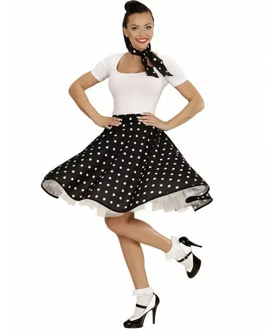 Swing til 50-tallets lyder Dette 50-tallskostymet for kvinner består av et skjørt og et skjerf (topp, tutu, sokker og sko er ikke inkludert). Det tykke skjørtet er svart med hvite prikker. Det lukkes enkelt på siden med 3 svarte plastknapper. Disse knappene lar deg enkelt tilpasse skjørtet til kroppsfasongen din. Et matchende skjerf følger med dette utsvingte skjørtet. Det knytes i halsen. Dette settet vil være perfekt for å legemliggjøre en pen 50-tallsdanser på en retrofest. Inkludert tilbehør: Kjole Skjerf Materiale: 100 % polyester Vedlikehold: Håndvask