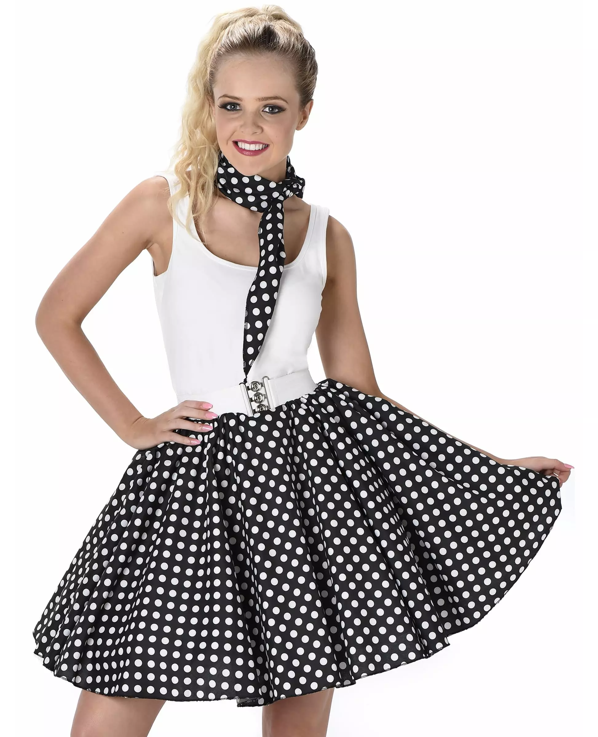 Kom i 50-tallsstemning! Dette 50-tallskostymet for kvinner består av et skjørt og en bandana (topp og sko er ikke inkludert). Det utsvingte skjørtet er svart med hvite prikker. Et elastisk belte er sydd direkte til livet. Det lukkes med en sølvfarget metallspenne. Et svart skjerf med hvite prikker fullfører dette pene antrekket. Dette retro-settet vil være perfekt for å delta på en 50-talls temakveld. Inkludert tilbehør: Skjørt med belte Skjerf Materiale: 100 % polyester Vedlikehold: Håndvask Målinformasjon: For størrelse S er skjørtet omtrent 45 cm langt (ekskl. belte)