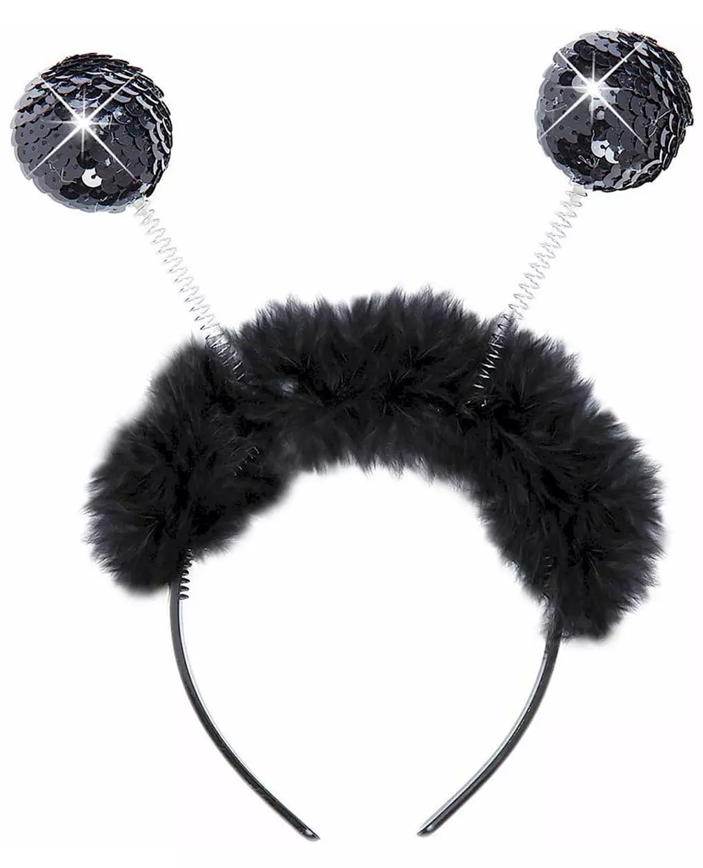Et mykt og blendende tilbehør! Dette pannebåndet for voksne er laget av svart plast. På den øvre delen er det dekket med et svart pelslignende stoff for en veldig myk stil! Det er også dekorert med to fjærantenner toppet med svarte paljettballer. Dette pannebåndet vil perfekt tilbehøre dine disco-antrekk, for eksempel under en temafest, nyttårsaften eller karneval!. Inkludert tilbehør: Pannebånd