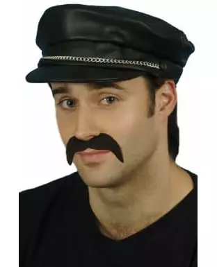 Lett å ri! Denne bikercapsen er laget av matt imitert skinn. Hodeomkretsen er omtrent 58 cm. Den er svart og har en kjede over skyggen. Dette tilbehøret vil være ideelt for å fullføre bikerkostymet ditt til karneval eller en utkledningsfest. Inkludert tilbehør: Capsmateriale: Syntetisk