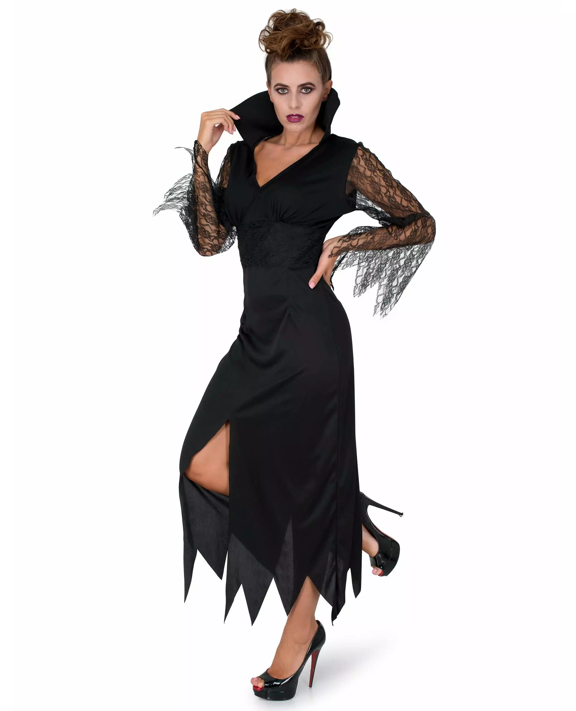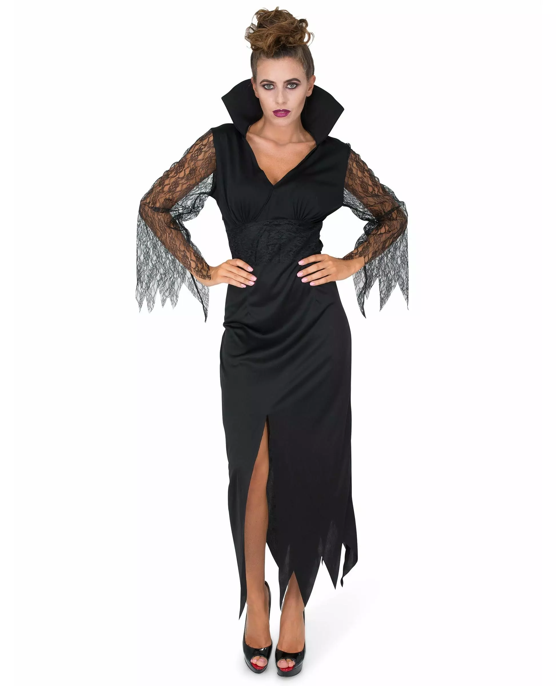 En veldig vakker heks! Dette heksekostymet består av en kjole. Den svarte kjolen er lang med en splitt foran. Den har en krage og utskjæringer nederst. Ermene er laget av gjennomsiktig svart blonder. Denne blondekjolen for kvinner vil gjøre deg til en ekte heks denne Halloween! Inkludert tilbehør: Kjole Materiale: 100 % polyester Pleie: Håndvask