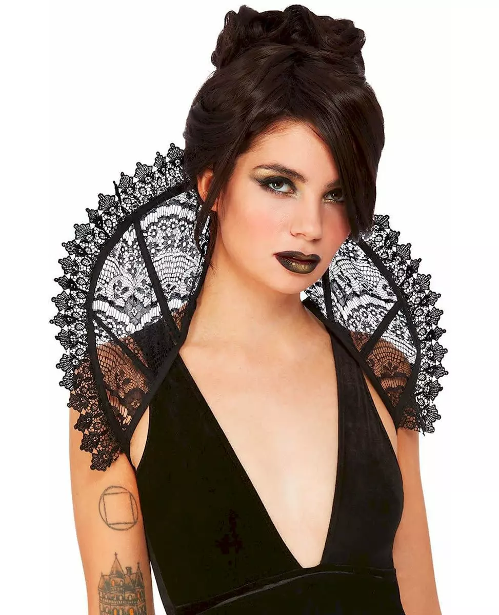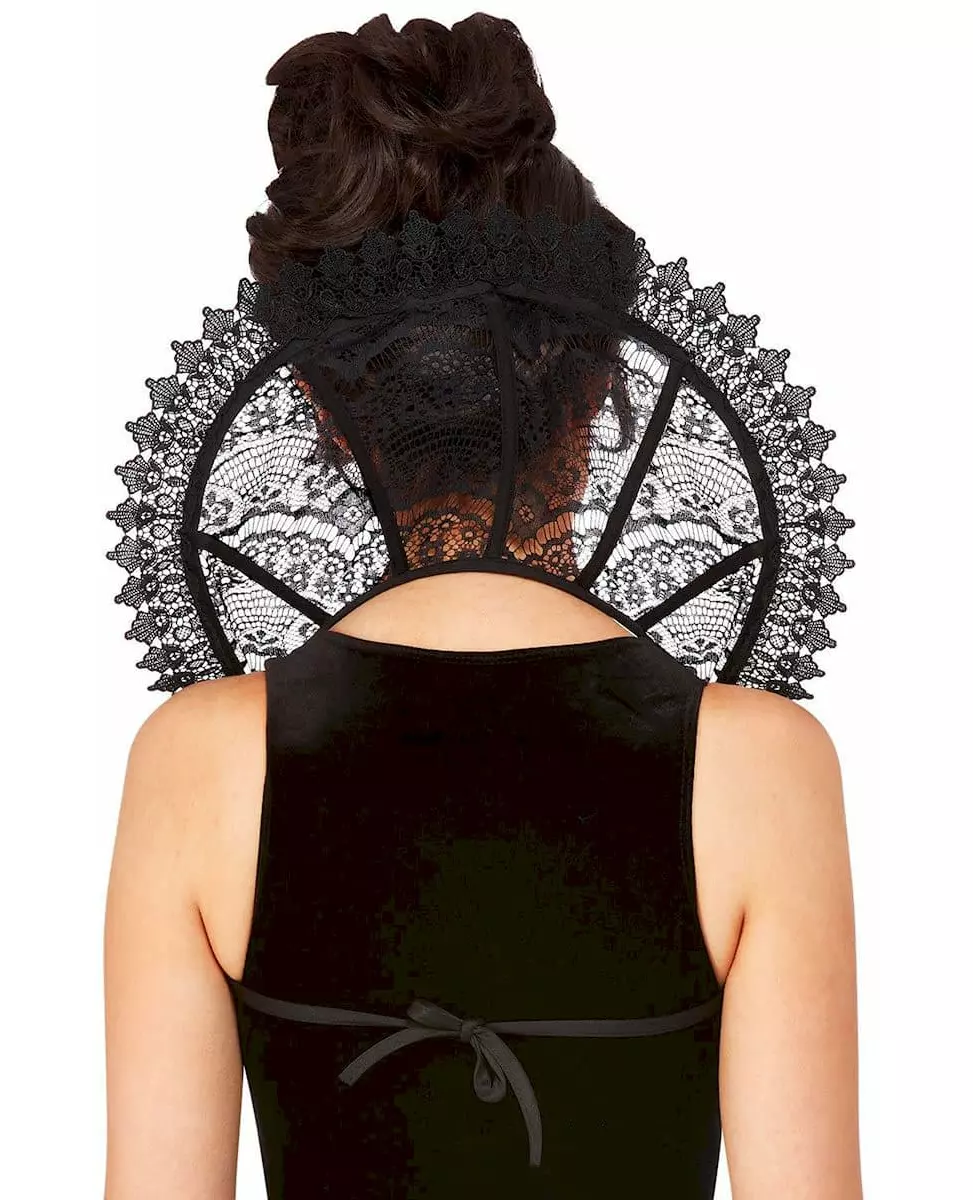 En elegant og ond krage Denne svarte blondekragen er for kvinner. Denne kragen skal plasseres på skuldrene. Et knytebånd som skal føres under armene og festes bak, sikrer god støtte for denne rette kragen. Stive rammer bidrar til å opprettholde formen på denne kragen. En suveren krage som fullfører mange forkledninger, som gotiske kostymer, vampyrkostymer eller onde heksekostymer på Halloween-kvelden. Inkludert tilbehør: Krage Materiale: 100 % polyesterstoff