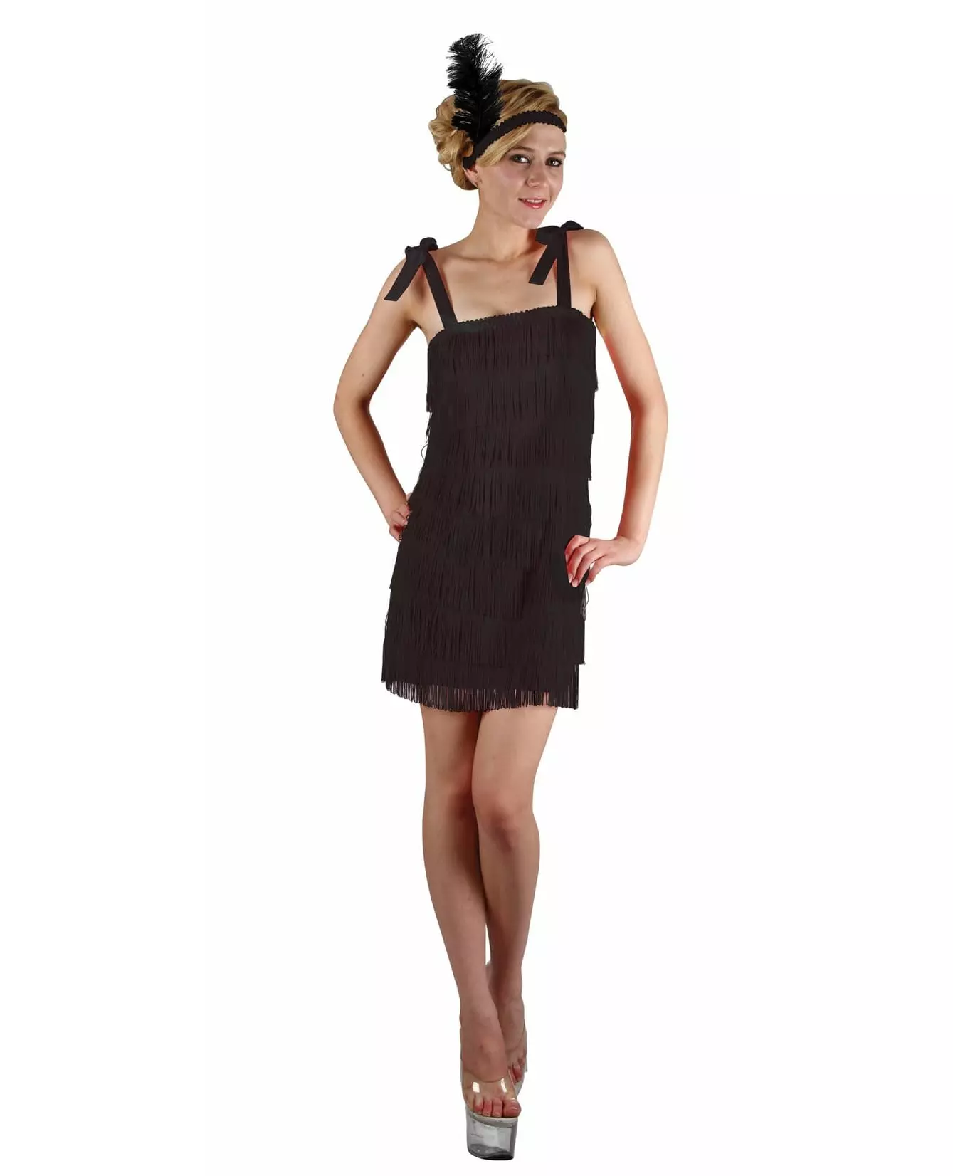 Gjenopplev Charleston-årene! Dette Charleston-kostymet for kvinner består av en kjole og et hodeplagg (sko, halskjede, sigarettrør og parykk er ikke inkludert). Den korte kjolen har flere rader med svarte frynser kun på forsiden. De svarte stroppene er brede satengbånd som du kan knyte som du ønsker. Toppen av kjolen er elastisk og er foret med skinnende svarte paljetter. Hodeplagg er et elastisk bånd med svarte paljetter som det er limt en svart fjær på. Dette Charleston-kostymet vil være perfekt for å gjenoppleve 20-tallet under en kostymefest. Inkludert tilbehør: Kjole Hodeplagg Materiale: 100 % polyester Stell: Håndvask Målinformasjon: For størrelse S er kjolens lengde 65 cm uten stroppene For størrelse M er kjolens lengde 69 cm uten stroppene