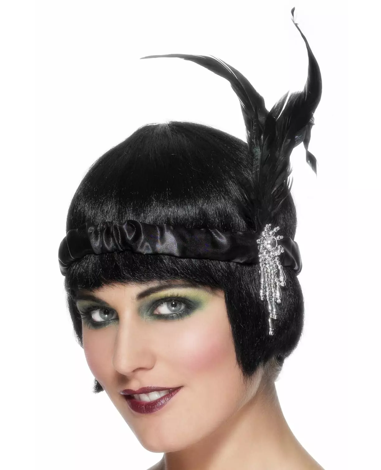 Med vakre fjær! Dette Charleston-pannebåndet er laget av svart sateng med fjær og en juvel. Pannebåndet er elastisk og tilpasser seg derfor alle hoder. Fjærene er omtrent 15 cm lange, de er svarte med vakre refleksjoner i lyset. Juvelene er sølvfargede og representerer perler. Dette pannebåndet er ideelt for å fullføre et Charleston- eller til og med et divakostyme ... Det vil gi det lille ekstra preget som lar deg gli inn i kveldens atmosfære.