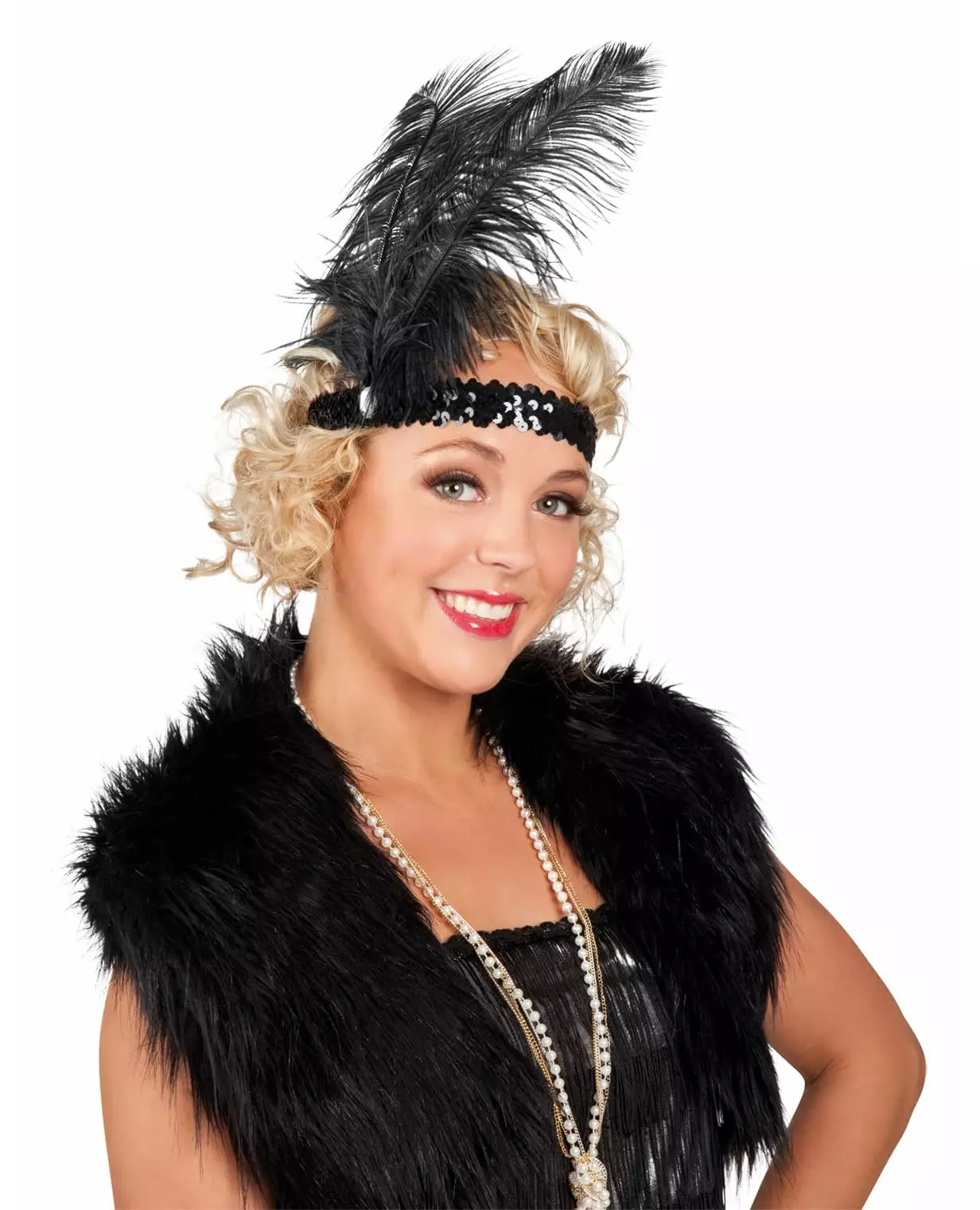 Veldig fint retro-pannebånd! Dette svarte Charleston-pannebåndet har en svart fjær, et skinnende svart paljettperlepannebånd og en edelsten dekorert med små sølvperler. Det er elastisk. Dette tilbehøret vil være ideelt for å perfeksjonere retro-kostymet ditt på utkledningsfester eller temafester. Inkludert tilbehør: Pannebånd Materiale: Syntetisk