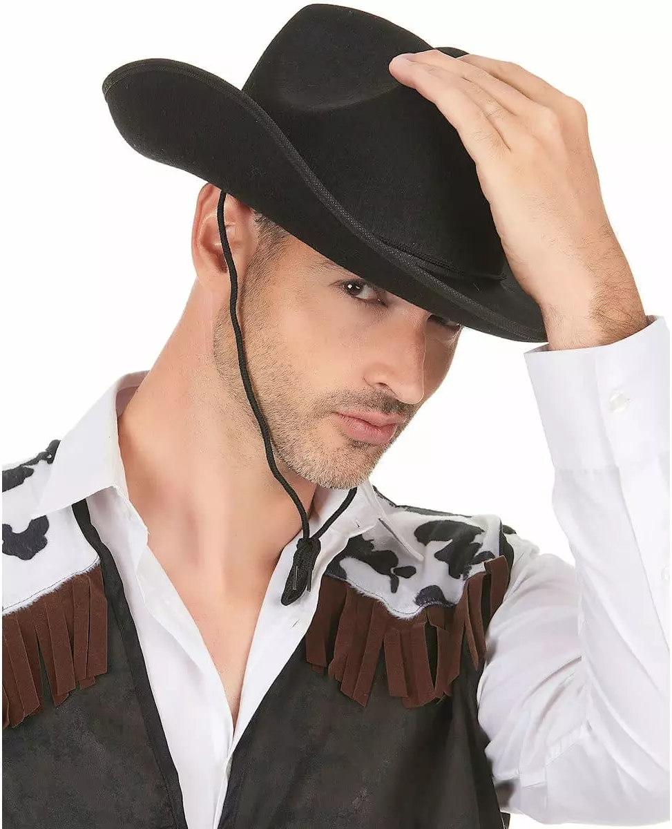 Intens svart farge! Denne cowboyhatten for voksne har en veldig buet kant på sidene. En svart stropp glir under haken for bedre støtte. Denne hatten har en hodeomkrets på omtrent 60 cm. Denne hatten er ideell for å fullføre kostymet ditt under temafester. Inkludert tilbehør: Hattmateriale: Polyester