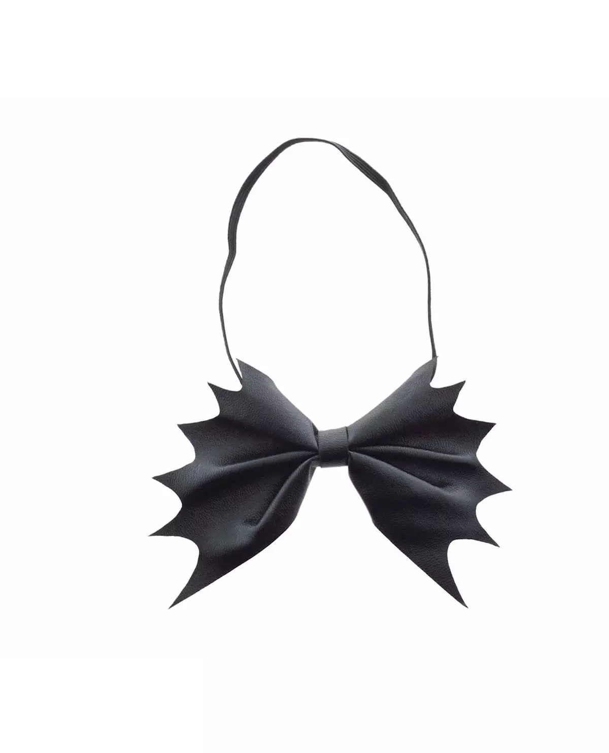 En spesiell flaggermussløyfe! Denne flaggermussløyfen er for voksne. Tilbehøret er svart i fargen, ser ut som det er laget av lær og har en vakker flaggermusvingeform. Det er enkelt og behagelig å ha på seg, og holdes rundt halsen med en strikk. Dette tilbehøret lar deg fullføre et stort antall forkledninger under en temafest eller til Halloween-festen din! Inkludert tilbehør: Sløyfe Vedlikehold: Ikke vask