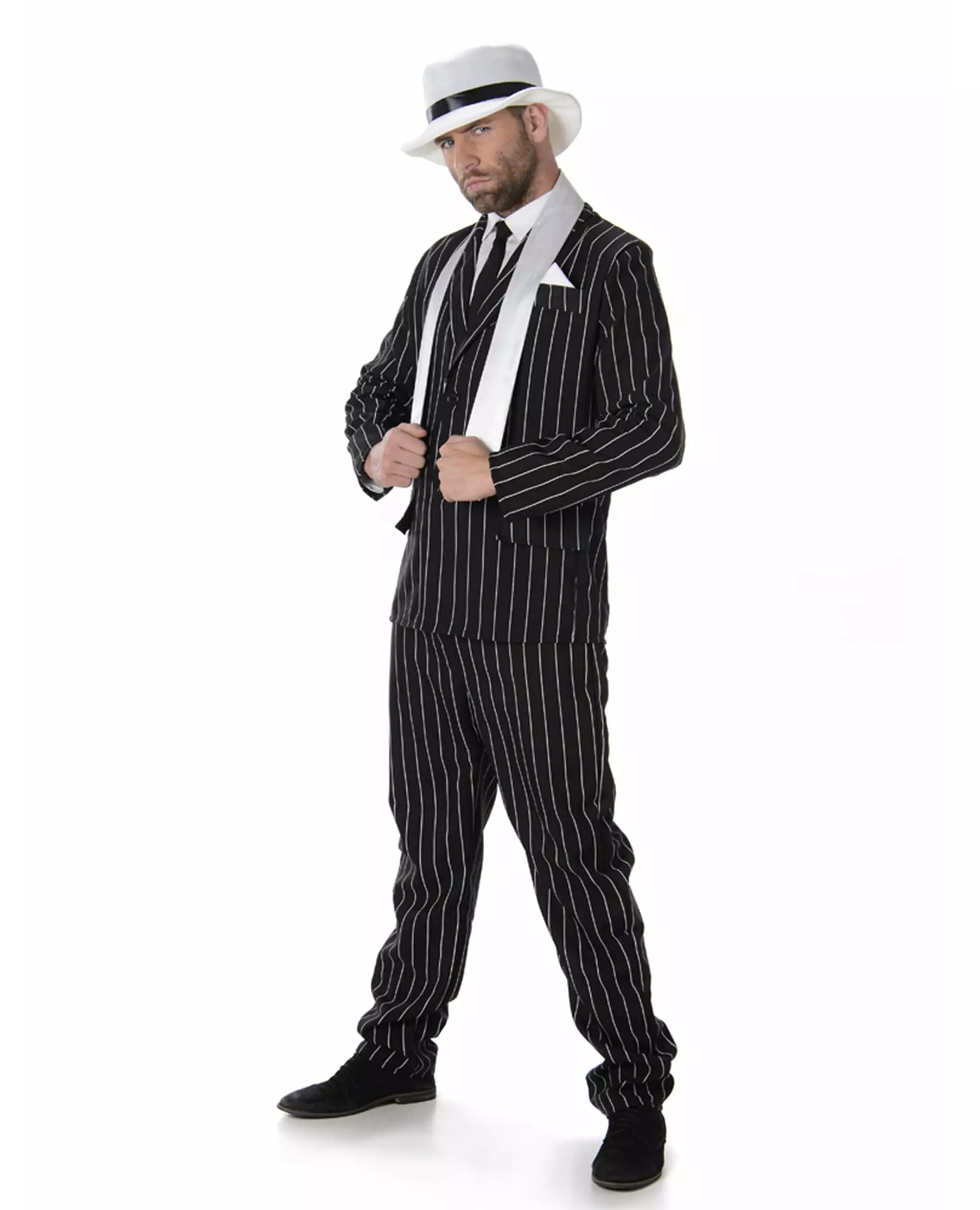 Forvandle deg til en 30-talls gangster. Dette gangsterkostymet for menn består av en jakke, bukse, lue og skjerf. Jakken og buksene er laget av samme svarte stoff med tynne hvite striper. Jakken har falske lommer foran og lukkes foran med to knapper. Buksene har en elastisk midje. Skumhatten er hvit med et svart satengbånd nederst. Til slutt fullfører et kort hvitt satengskjerf kostymet. Dette kostymet vil være perfekt for å late som om du er en ekte gangster til en kveld med 1930-tallstema. Inkludert tilbehør: Jakke, bukser, lue, skjerf. Materiale: 100 % polyester. Vedlikehold: Håndvask. Målinformasjon: For størrelse XL er jakken 78 cm lang og buksene ca. 114 cm lange.