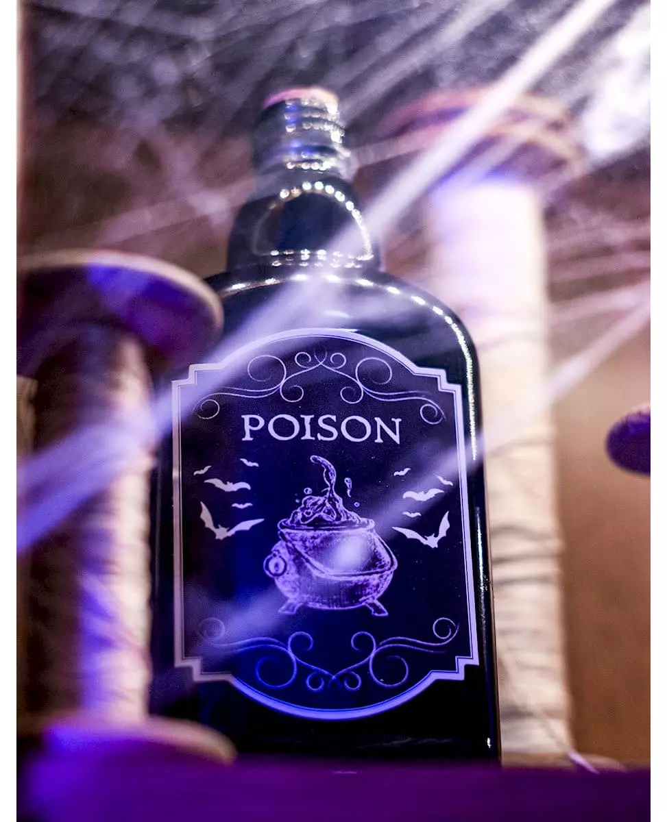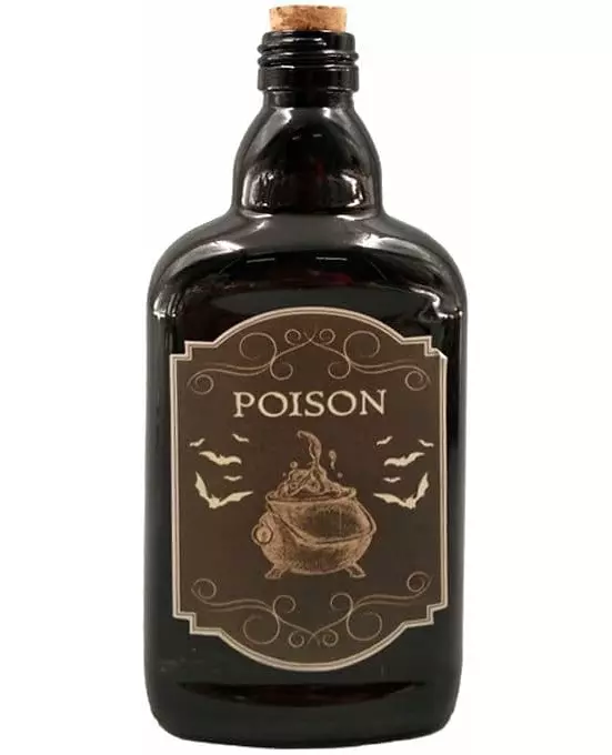 En skremmende flaske! Denne giftflasken måler omtrent 19 cm høy. Den er svart med en hvit etikett, med et hodeskalletrykk med en krone og ordene «Marias blod». En kork lukker flasken. Denne flasken vil være perfekt for å fullføre Halloween-dekorasjonen din! Inkludert tilbehør: 1 flaske
