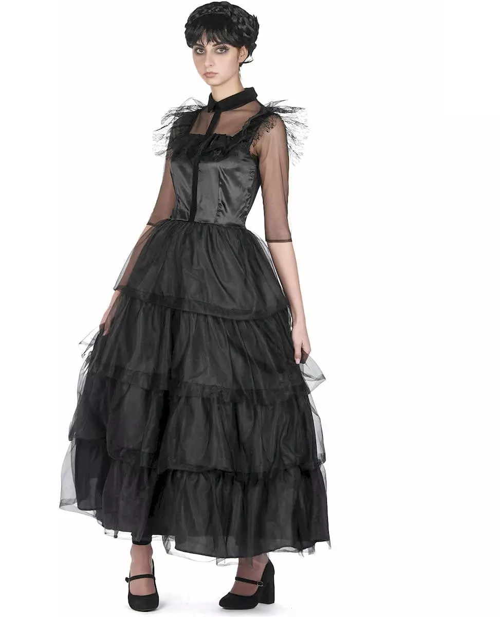 Bli den gotiske skoleballdronningen denne Halloween! Dette svarte gotiske skoleballkostymet er for kvinner. Det består av en lang svart kjole med rysjer og en hårspenne. Rysjene gir en fløyelseffekt. Toppen har en blondekrage. Ermene er gjennomsiktige og mellomlange. Kjolen har glidelåslukking bak. De svarte rysjene gir kjolen en elegant og voluminøs effekt takket være deres nettlignende utseende. Hårspennen er svart og inkluderer en svart rose på toppen. Velg en flettet frisyre for å fullføre dette gotiske antrekket. Denne gotiske kjolen vil være perfekt til din neste Halloween-fest! Inkludert tilbehør: Svart kjole med rysjer Hårspenne Materiale: 100 % polyester Vedlikehold: Håndvask