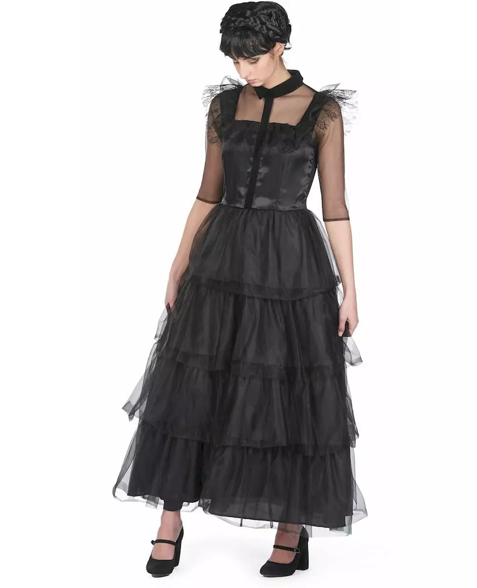 Bli den gotiske skoleballdronningen denne Halloween! Dette svarte gotiske skoleballkostymet er for kvinner. Det består av en lang svart kjole med rysjer og en hårspenne. Rysjene gir en fløyelseffekt. Toppen har en blondekrage. Ermene er gjennomsiktige og mellomlange. Kjolen har glidelåslukking bak. De svarte rysjene gir kjolen en elegant og voluminøs effekt takket være deres nettlignende utseende. Hårspennen er svart og inkluderer en svart rose på toppen. Velg en flettet frisyre for å fullføre dette gotiske antrekket. Denne gotiske kjolen vil være perfekt til din neste Halloween-fest! Inkludert tilbehør: Svart kjole med rysjer Hårspenne Materiale: 100 % polyester Vedlikehold: Håndvask