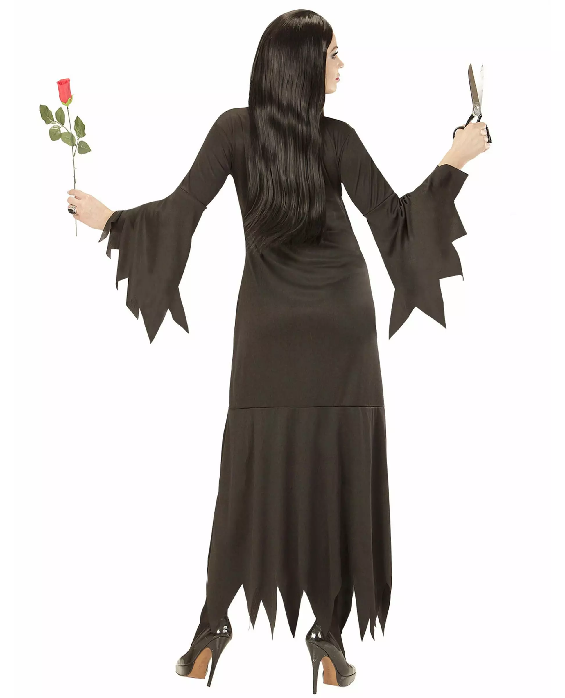 Er du fristet av det gotiske utseendet? Fall for denne svarte kjolen Dette gotiske kostymet for kvinner består av en kjole (tilbehør ikke inkludert). Kjolen er svart med lange, utsvingte ermer. Hver ende av kjolen ender med sagtenner. Dette kostymet vil være enkelt og effektivt for en fin kveld på et kostymefest. Inkludert tilbehør: Kjole Materiale: 100 % polyester Pleie: Håndvask