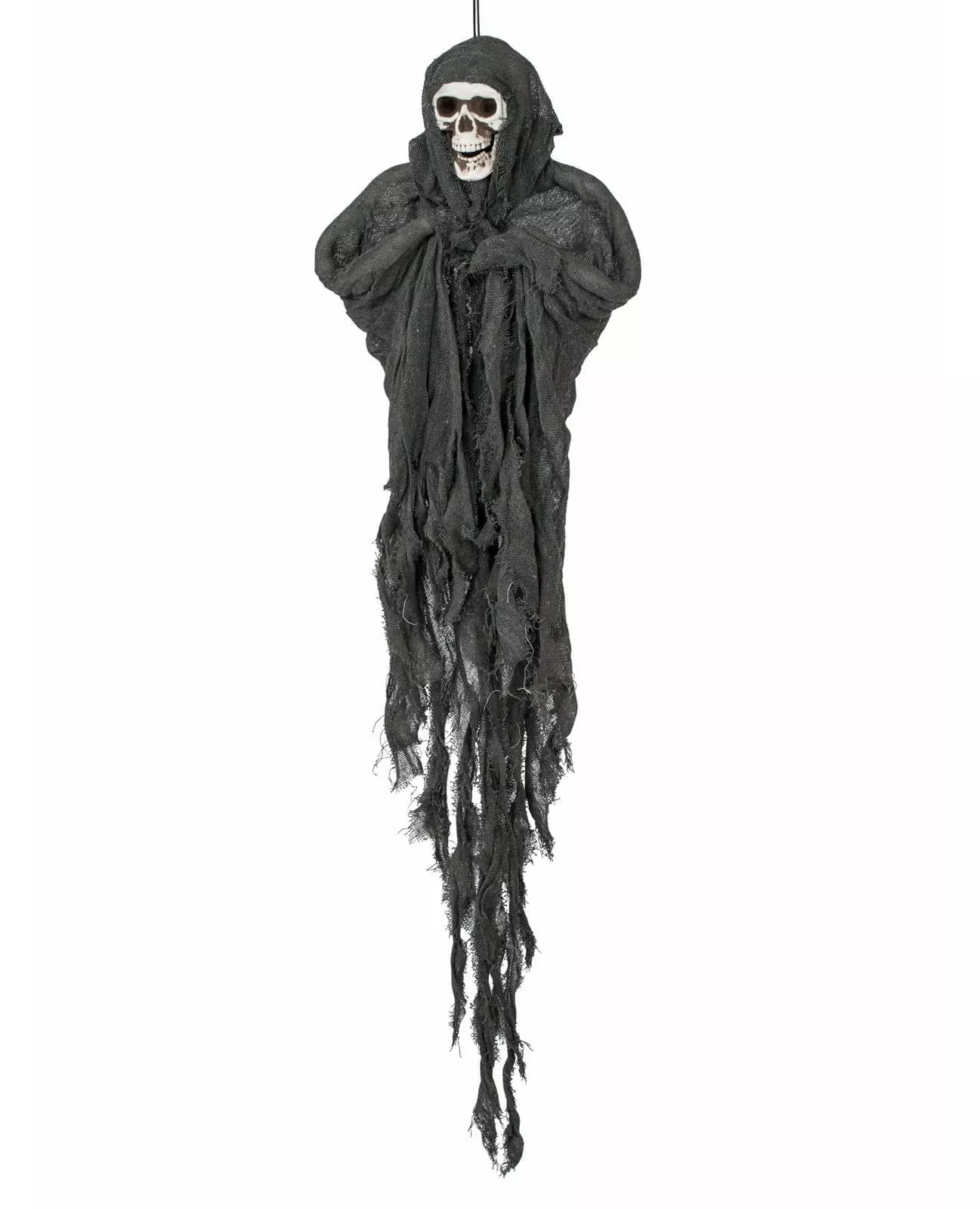 Skap en skummel atmosfære til Halloween-festen din! Denne svarte hengende Grim Reaper-dekorasjonen måler omtrent 90 cm i høyden. Armene kan deformeres slik du ønsker, takket være metallstengene inni. Det revne stoffet gir enda mer dysterhet til hele greia, som kan festes hvor som helst takket være snoren som er plassert over skjelettets plasthode. For en skrekk-tema-setting på rommet ditt, vil denne hengende dekorasjonen være ideell for å skremme! Inkludert tilbehør: Grim Reaper-dekorasjon Materiale: Plast og polyester