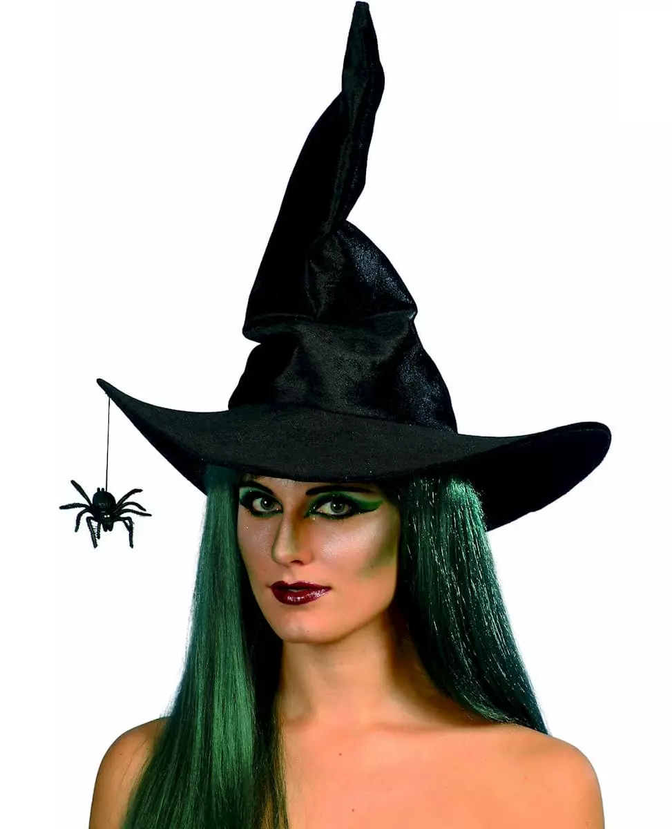 Fløyel! Denne heksehatten med fløyelseffekt har en edderkopp på forsiden. Den måler 53 cm høy og har en hodeomkrets på omtrent 63 cm. Den vil være det essensielle tilbehøret til heksekostymet ditt denne Halloween. Inkludert tilbehør: Hattpleie: Håndvask i kaldt vann
