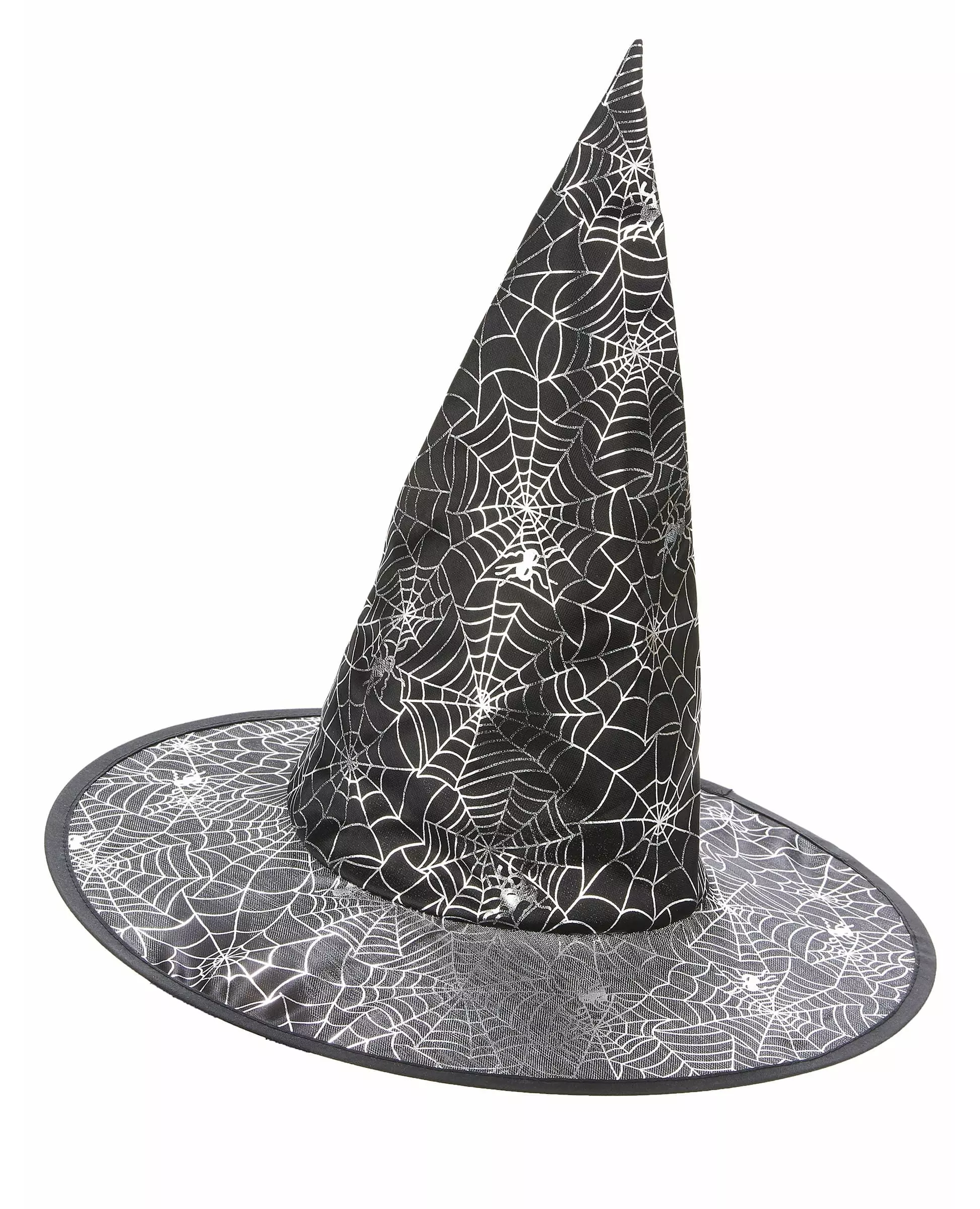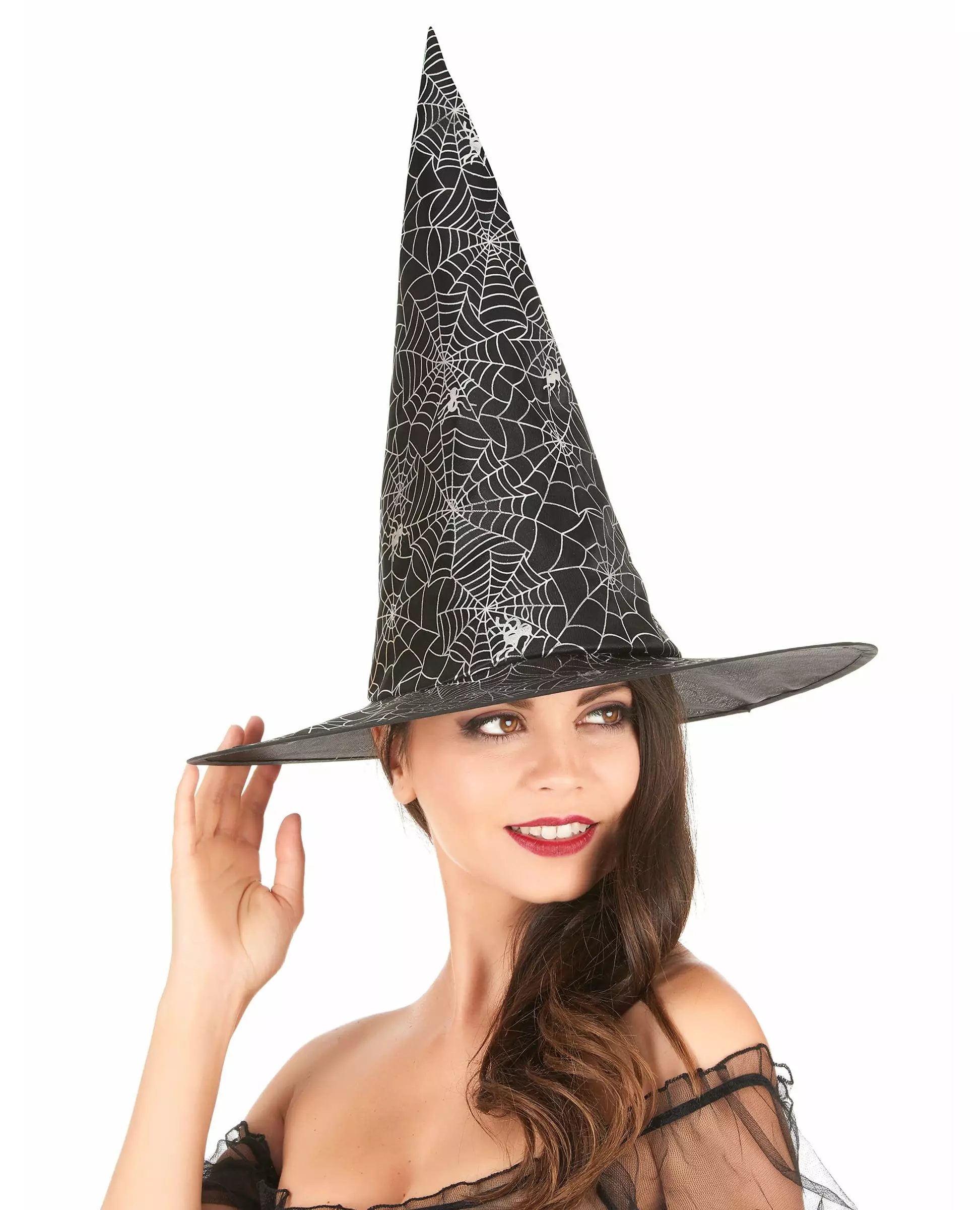 En ekte heks! Denne heksehatten er for voksne. Den er svart med sølvfargede spindelvevmønstre på den spisse delen, samt kantene på hatten, som har samme trykk. Denne hatten passer til hodestørrelser rundt 58 cm. For å fullføre heksekostymet ditt på Halloween-kvelden, vil denne spisse hatten være perfekt! Inkludert tilbehør: Hatt Materiale: Polyester
