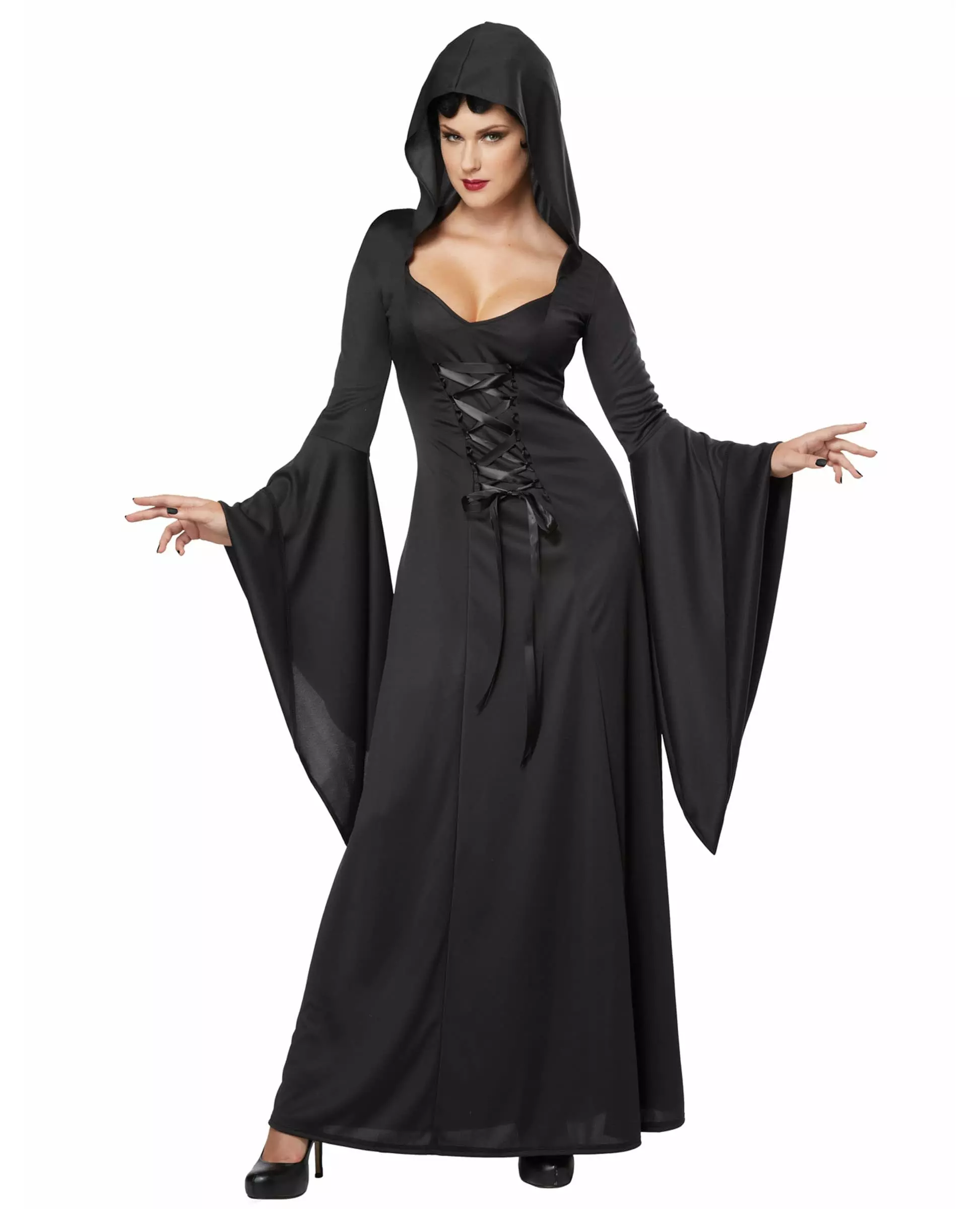 Gå for et helsvart Halloween-kostyme! Dette svarte heksekostymet for kvinner består av en lang kjole (sko ikke inkludert). Kjolen har lange, utsvingte ermer. Det er svart snøring foran på kjolen, slik at du kan justere den til kroppsfasongen din. Kjolen har også hette. Denne gotiske grevinnekjolen vil være perfekt for å avsløre din mørke side på Halloween-kvelden. Inkludert tilbehør: Kjole Materiale: 100 % polyester Pleie: Håndvask