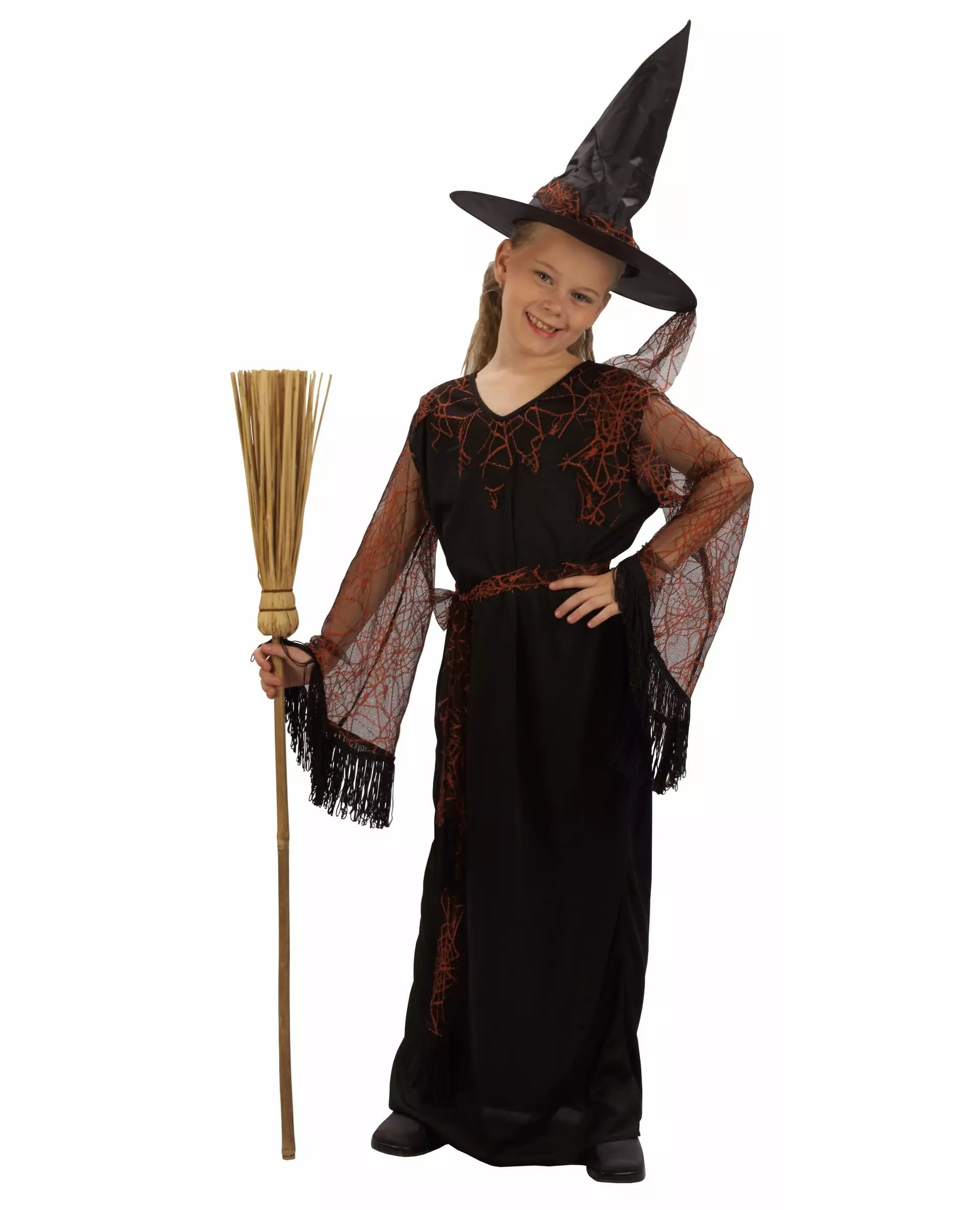 Spindelvev-effekt på ermene! Dette Halloween-heksekostymet består av en kjole, et belte og en hatt. (Kosteskaft og sko er ikke inkludert). Kjolen er lang, svart og har en lav halsutringning. Ermene er laget av imitert blonde med spindelvevmønstre. De er oransje og avsluttet med svart blonde. Halsutringningen er sydd med samme type oransje blonde. Klippt i spisser, gir det inntrykk av et halskjede. Beltet matcher antrekket og festes til midjen med borrelås. Til slutt er hatten svart med det oransje edderkoppblonderpannebåndet. Dette elegante kostymet vil være perfekt for å gå på jakt etter godteri på Halloween-kvelden eller til et show. Inkludert tilbehør: Kjole Hatt Belte Materiale: 100 % polyester Vedlikehold: Håndvask