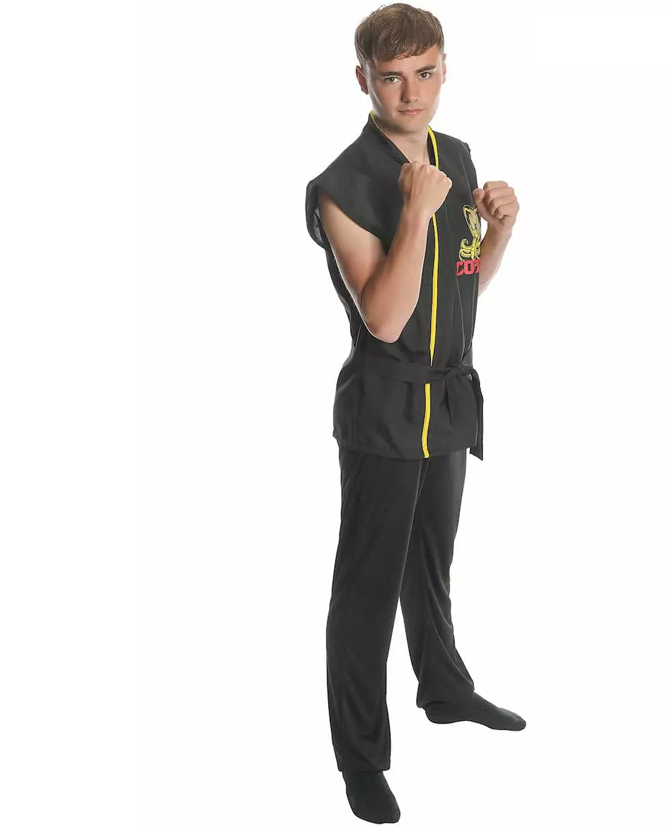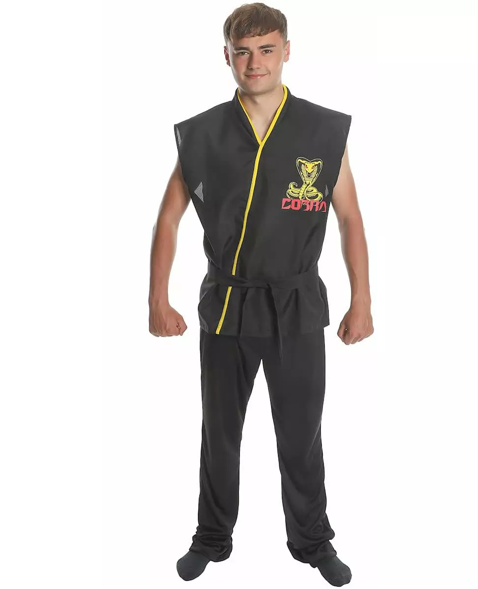 Spill som en karateelev! Dette karateelevkostymet er for voksne. Det inkluderer en topp, bukser og et belte. Toppen er en ermeløs, svart, vid topp med en gul kobralogo og ordet «kobra» i rødt. Buksene og beltet er også svarte. For en temafest eller karneval, velg dette karateelevkostymet! Inkludert tilbehør: Topp Bukser Belte Materiale: 100 % polyester Vedlikehold: Håndvask
