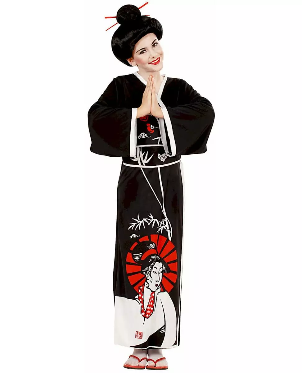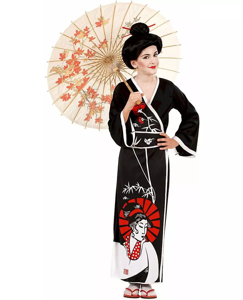 Reis til den stigende solens land! Dette kostymet inkluderer en kimono, et belte og spisepinner (parykk, flip-flops og sokker er ikke inkludert). Den lange, svarte kimonoen har vide ermer. Under omslagssnittet lukkes den med borrelås i livet. En svart og hvit geisha pryder bunnen av kjolen; hodet hennes er omgitt av en rød glorie som matcher halsmønstrene. I tillegg lar et obi-belte deg justere livet; det strammes med bånd bak på antrekket. Fullfør kostymet ditt ved å feste spisepinnene til knuten din: geishalook garantert! Bli den mest elegante geishaen på utkledningsfestene dine! © Copyright Widmann SRL. Inkludert tilbehør: Kimonobele Spisepinner Materiale: 100 % polyester Vedlikehold: Håndvask