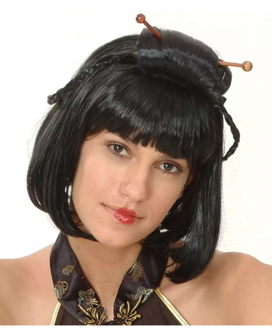 To spisepinner inkludert! Denne pene, svarte kinesiske parykken for kvinner har to spisepinner og to fletter på toppen av håret. Klippet er kortklippet med pannelugg. Denne parykken vil være ideell for å fullføre et kinesisk kostyme på en asiatisk-temafest eller til enhver annen festanledning. Inkludert tilbehør: Parykk Materiale: 100 % polyester 100 % polyester Stell: Håndvask