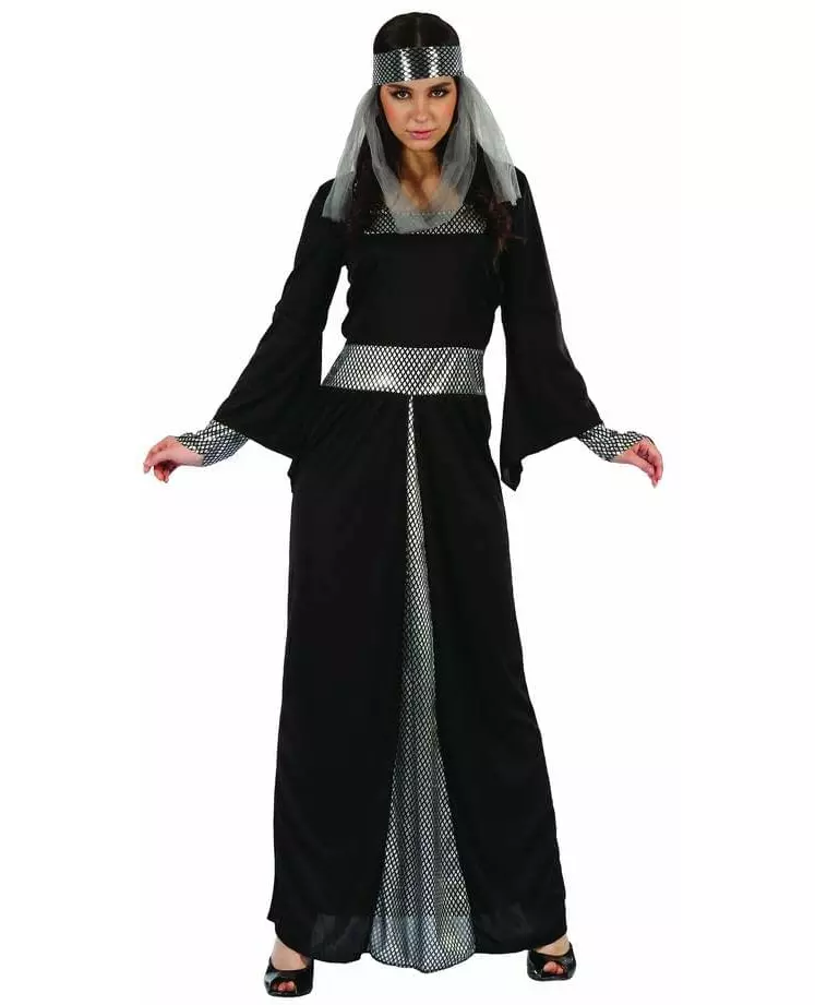 Slottsliv Dette kostymet for voksne minner om en dame fra middelalderen. Det inkluderer en kjole og et pannebånd (sko ikke inkludert). Polyesterkjolen er svart. Lett tettsittende i midjen og har vide ermer. Sølvfargede detaljer i midjen, kragen og ermene minner om datidens ringbrynje. Det elastiske pannebåndet har de samme mønstrene som simulerer nettet. 30 cm grå tyllslør er sydd på sidene av pannebåndet. I løpet av en kveld med historisk tema, vær skjønnheten hvis ære en ridder vil forsvare. Inkludert tilbehør: Kjolepannebånd Materiale: 100 % polyester Pleie: Håndvask