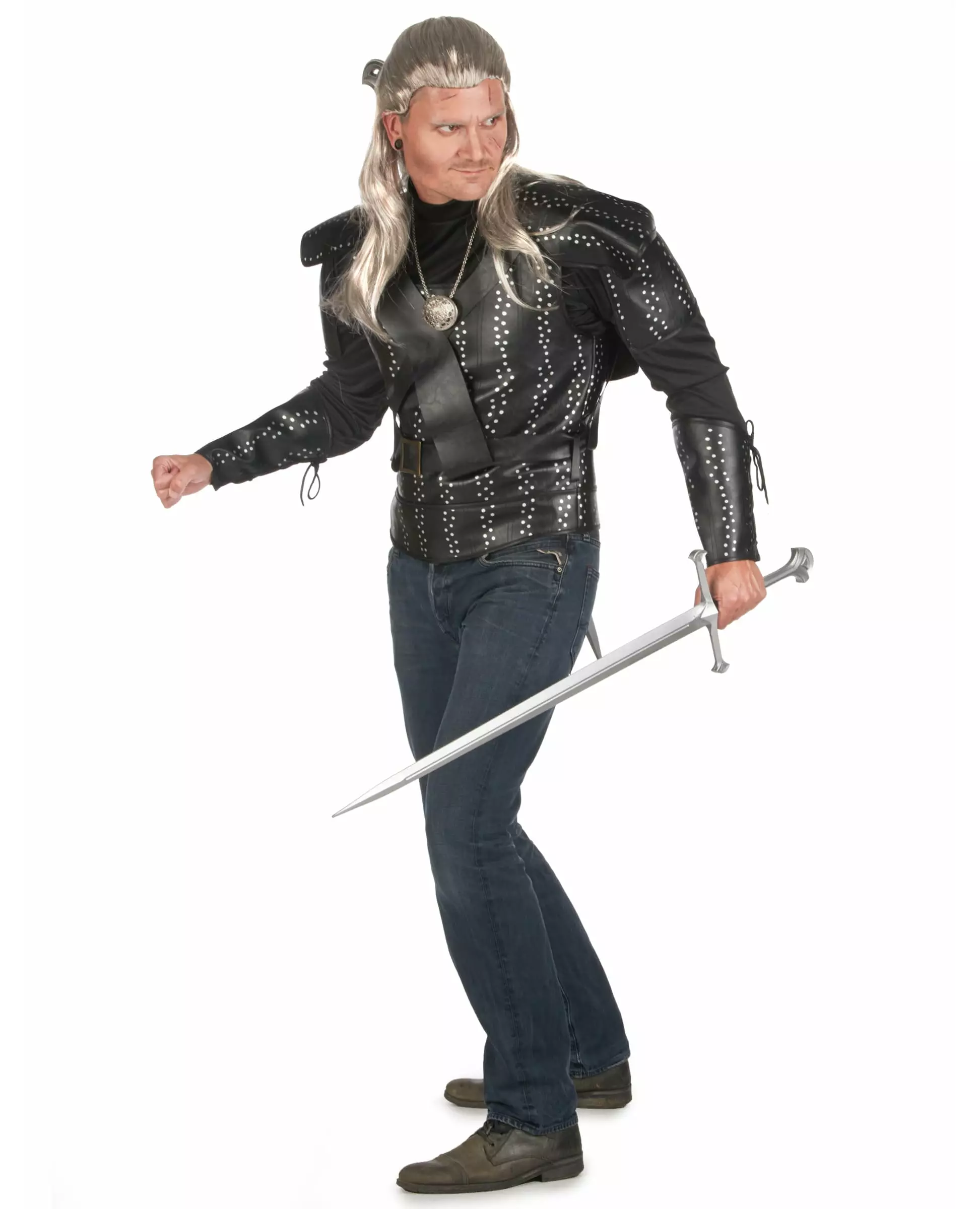 Bli trollmannen! Dette mordertrollmannskostymet er for voksne og består av en topp, en brystbeskytter og skulderputer. Toppen er svart med mansjetter i læreffekt dekorert med hvite prikker for et naglete utseende, som brystbeskytteren og skulderputene. Mansjettene er dekorert med svart imitert blonder, og skulderputene har stropper. Bli en ekte trollmann til Halloween med dette mordertrollmannskostymet!. Inkludert tilbehør: Topp Brystbeskytter Skulderpute Materiale: 50 % polyester, 50 % PVC Stell: Håndvask
