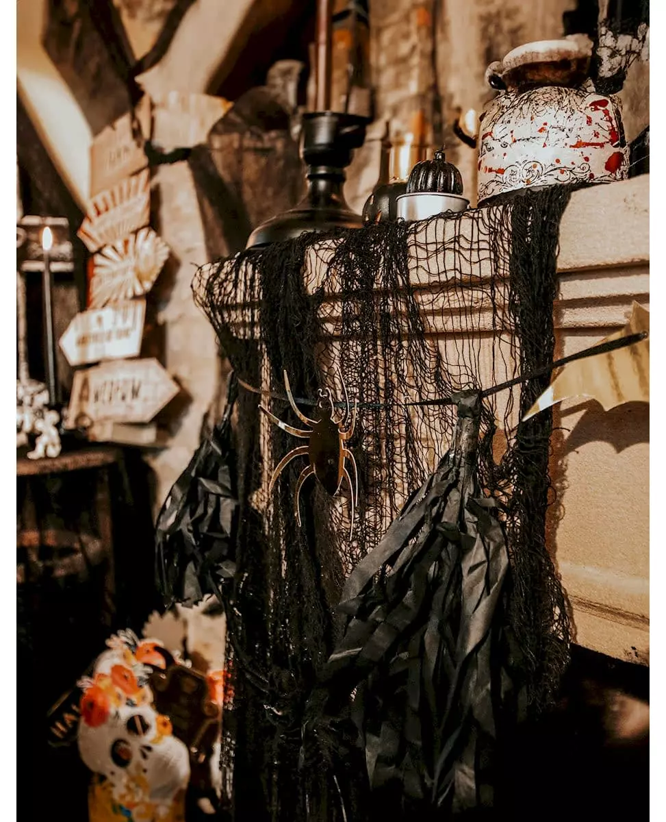 En original girlander for grøsskvelden...! Denne Halloween-girlanderen måler omtrent 2 meter i lengden. Den har en lang snor for å feste svarte dusker samt små dekorasjoner i form av flaggermus, spindelvev og gyldne edderkopper. Denne lange girlanderen vil være ideell for å perfeksjonere interiørdekorasjonen din under Halloween-kvelden! Inkludert tilbehør: 1 girlander Materiale: Plast