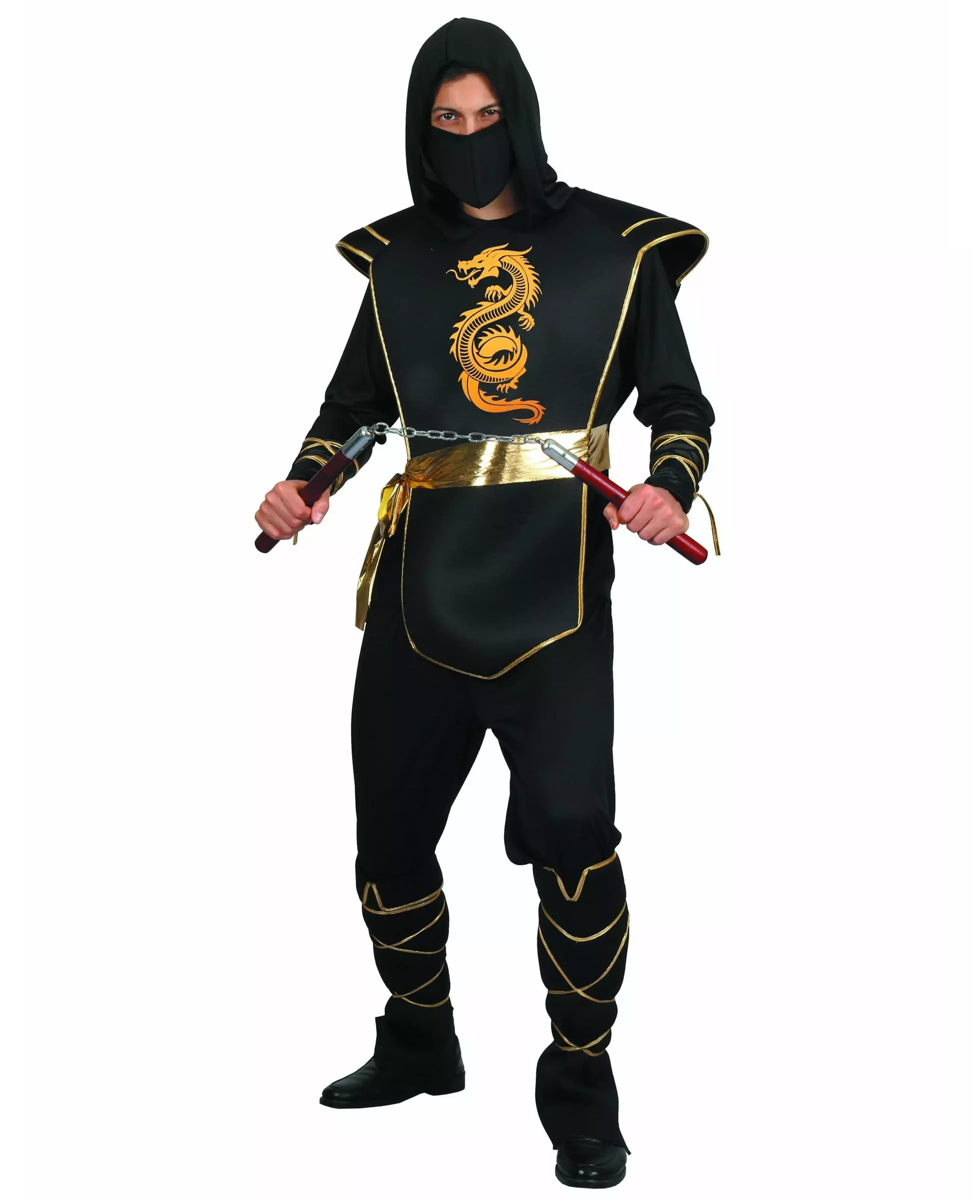 Ninjaenes kunst! Dette ninjakostymet inkluderer en hettegenser, rustning, belte og leggings (våpen ikke inkludert). Settet er svart og fleksibelt. Den myke skumrustningen har en gyllen drage trykt på forsiden. Det gylne beltet vil fremheve midjen. Leggingsene fullfører settet og gir et perfekt krigerutseende. Dette ninjakostymet for menn er ideelt for å forvandle seg til en japansk kriger til en kostymefest som karneval eller andre anledninger. Inkludert tilbehør: Hettegenser Rustning Maske Belte Benbeskyttere Materiale: 100 % polyester Vedlikehold: Håndvask