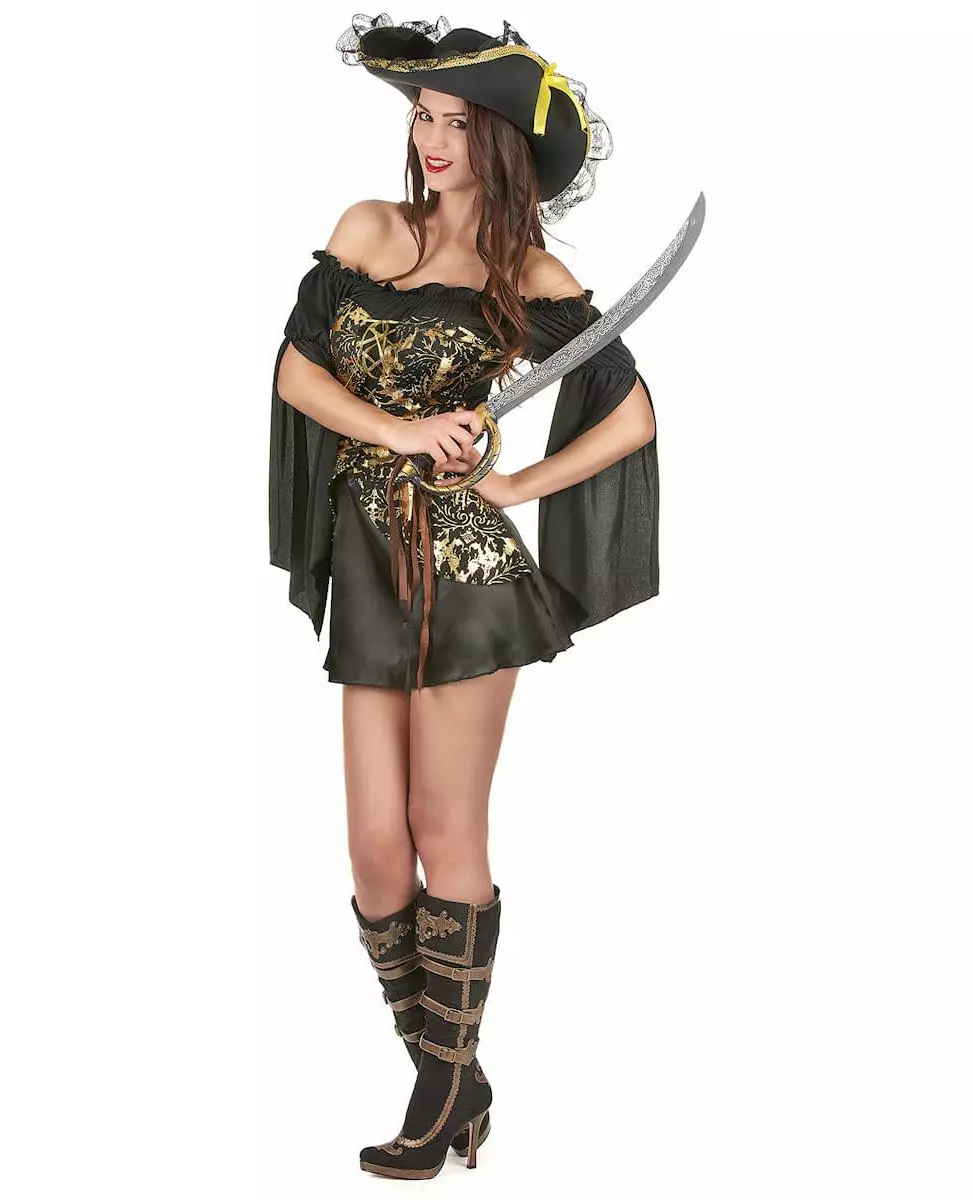Å hei, sjømann! Dette piratkostymet for kvinner inkluderer en kjole og en hatt (sabel og støvler er ikke inkludert). Kjolen er kort og svart. Laget av satengstoff, vil den være tettsittende i midjen takket være den falske overdelen foran. Den er laget av tykk filt dekorert med gull. Strikken i halsutringningen lar deg bruke denne kjolen med bare skuldre, og snitt i ermene vil gi enda mer sjarm til denne svært feminine kjolen. Hatten er laget av mykt skum. Kantene er pyntet med blonder og gull. To gule sløyfer er sydd på hver side. Den vil passe til de fleste med hodeomkretser nær 60 cm og vil være veldig behagelig å ha på seg. Du vil utvilsomt være den vakreste på karnevalet for eksempel med dette kapteinkostymet!. Inkludert tilbehør: Dresshatt Materiale: 100 % polyester Stell: Håndvaskbar