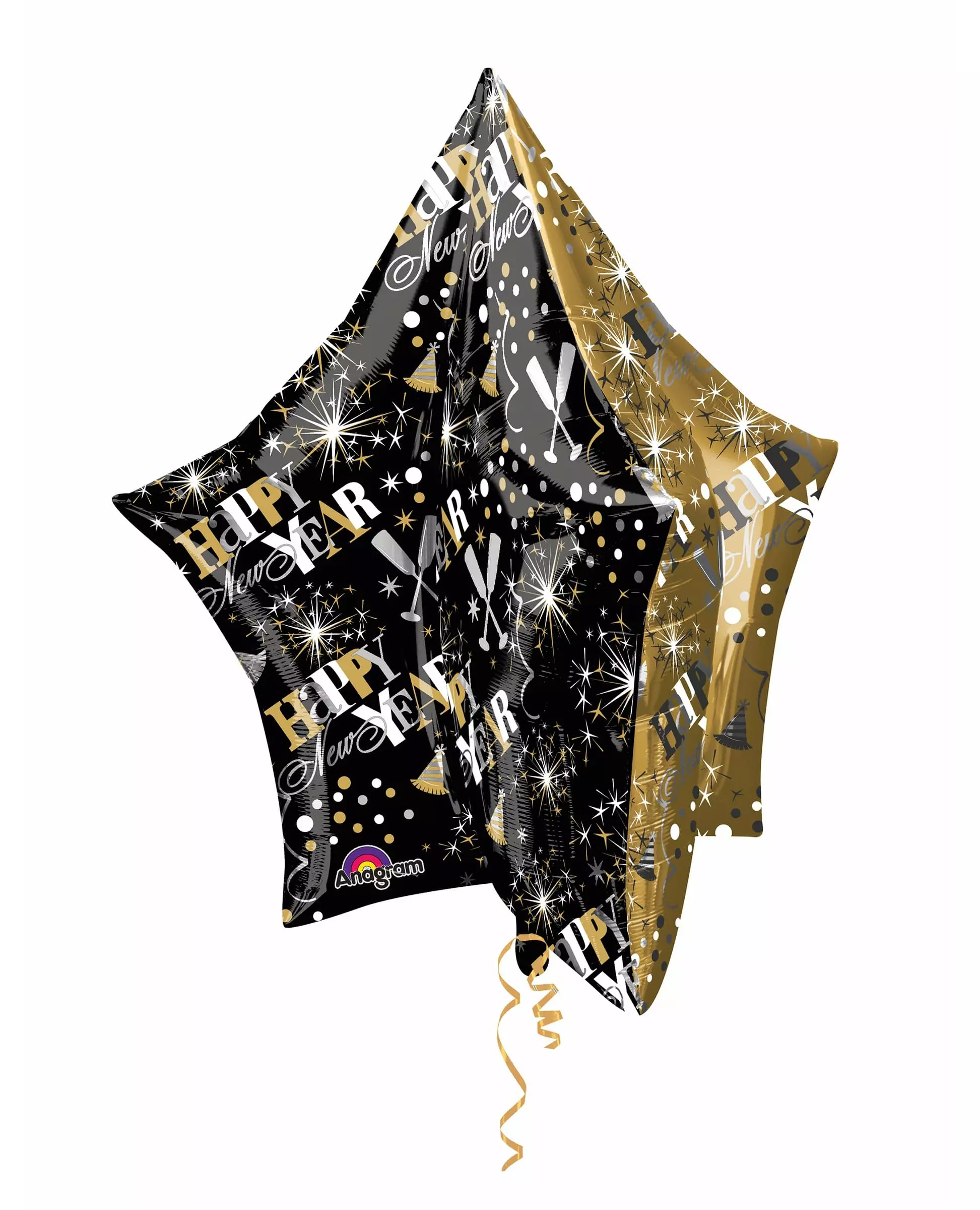 For et glitrende nyttår! Denne metalliske nyttårsballongen måler omtrent 81 cm x 86 cm. Den er stjerneformet og er sølv- og gullfarget. Den er trykket med ordene GODT NYTT ÅR ledsaget av champagneglass, fyrverkeri og hatter. Denne metalliske ballongen kan blåses opp med helium eller luft ved hjelp av et sugerør eller en ballongpumpe. Ideell for å dekorere rommet ditt til det nye året!. Inkludert tilbehør: Ballongmateriale: Aluminium