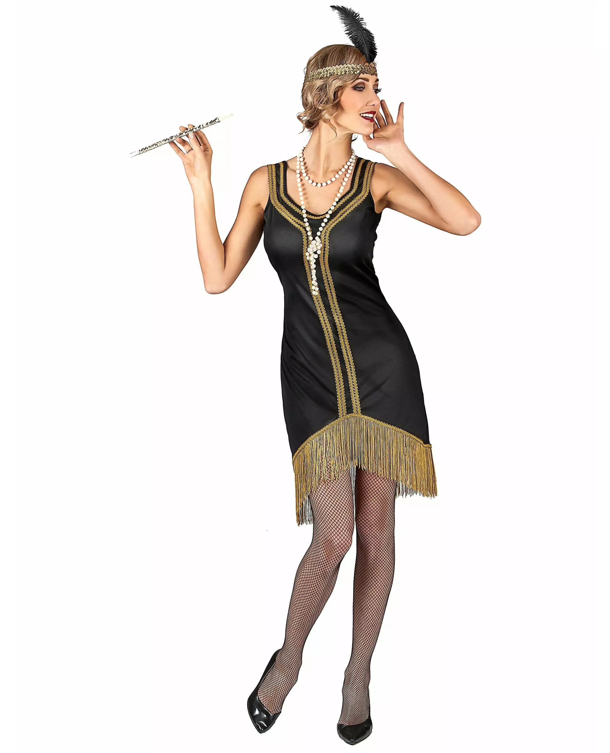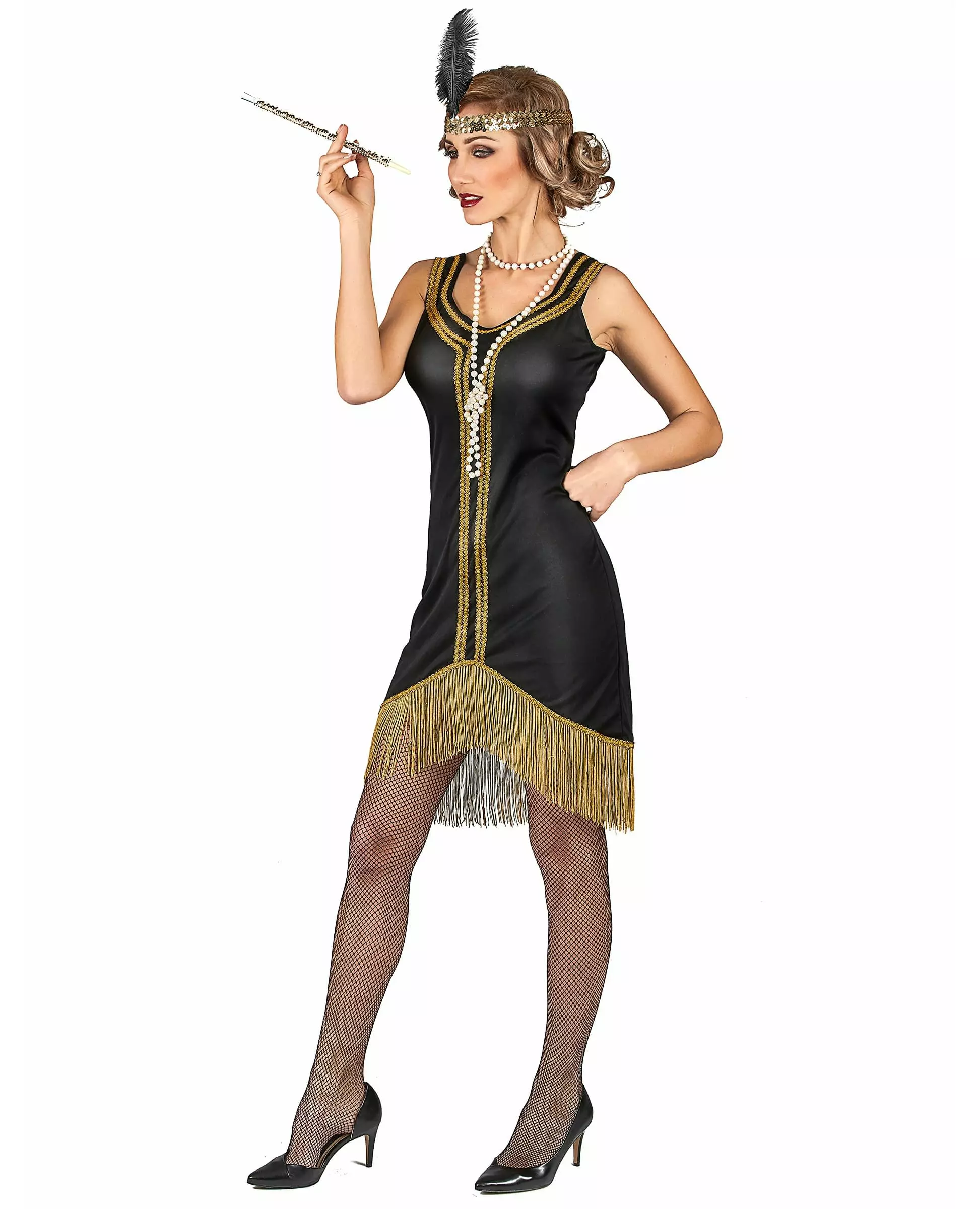 Så stilig det er på 20-tallet! Dette Charleston-kostymet for kvinner inkluderer en kjole og et hodeplagg. Kjolen er laget av mykt stoff som vil omfavne figuren din vakkert. Gullflette dekorerer kragen og midten av kroppen. Nederst på antrekket er det en vakker linje med frynser. Hver tråd vil perfekt følge hver av bevegelsene dine når du skisserer et dansetrinn. Det elastiske hodeplagget er dekket av skinnende gullpaljetter. En myk svart fjær pynter opp denne hodepynten. Du vil ikke bare være forkledd, men også utrolig stilig og sexy på en temafest! Inkludert tilbehør: Kjolepannebånd Materiale: 100 % polyester Stell: Håndvaskbar