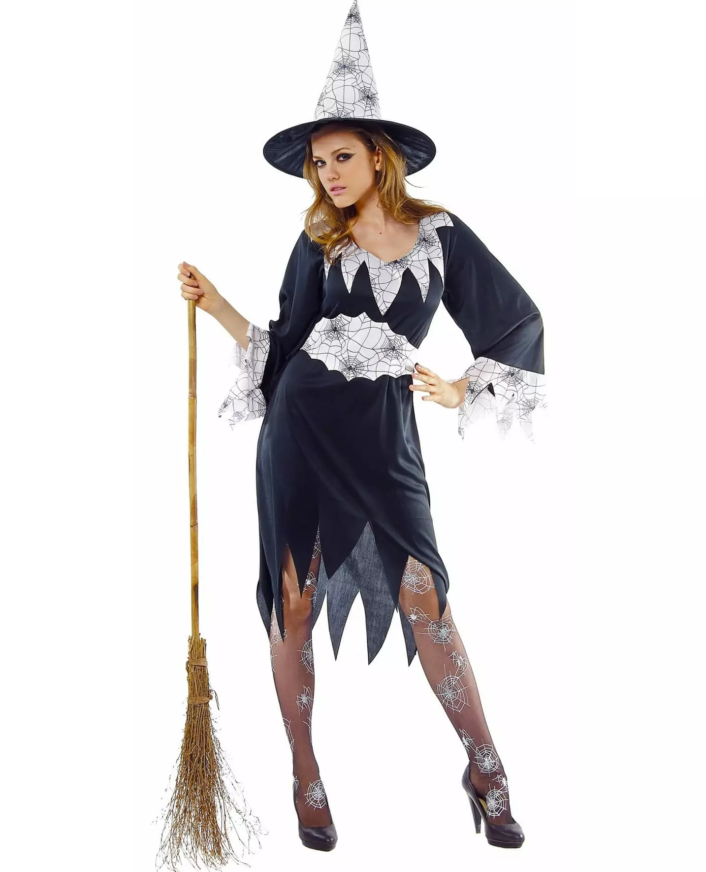 Bli en sann elskerinne i svart magi! Dette heksekostymet for kvinner består av en kjole, et belte og en hatt (kost, strømpebukser og sko er ikke inkludert). Den svarte kjolen er kuttet i spisser nederst og på ermene. De lange ermene er veldig utsvingte og har et hvitt stoff med spindelvevtrykk nederst på ermene. Kragen og bunnen av ermene er dekorert med et hvitt stoff kuttet i spisser der spindelvev er trykt. Et matchende hvitt belte vil markere midjen din med borrelås. Til slutt vil en spiss heksehatt sette prikken over i-en på kostymet ditt. Tuppen av hatten er hvit med mønstre som representerer svarte spindelvev. Dette kostymet vil være perfekt for å kaste trolldom på vennene dine i full frihet på Halloween-kvelden. Inkludert tilbehør: Kjole Belte Hatt Materiale: 100 % polyester Pleie: Håndvask