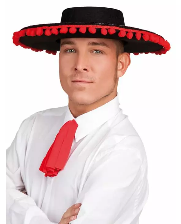 Med små pomponger! Denne spanske hatten i kunstfilt er svart og rød. Den måler 20 cm i diameter og vil være ideell for å fullføre et spansk antrekk til kostymefesten din.