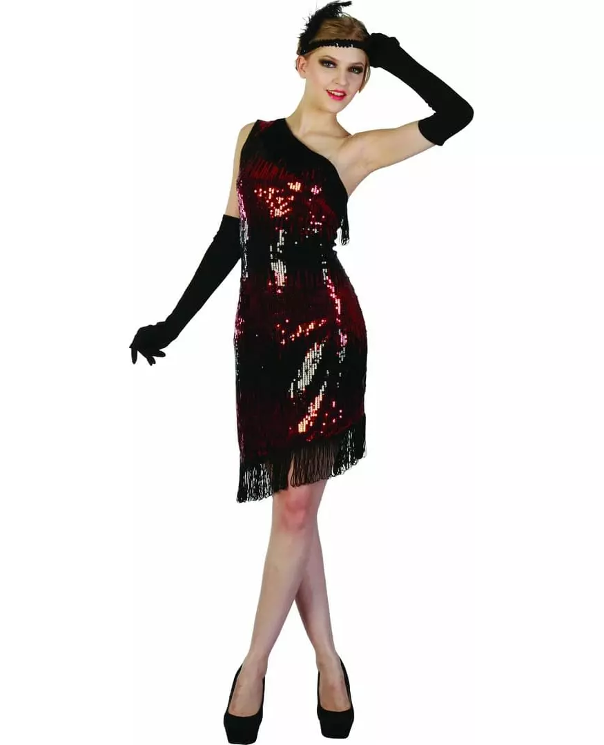 Gjenopplev 1920-tallet! Dette Charleston-kostymet for kvinner består av en kjole, et pannebånd og lange hansker (sko ikke inkludert). Den asymmetriske kjolen har svarte og røde paljetter foran og frynser på toppen og bunnen av antrekket. Denne Roaring Twenties-kjolen kompletteres med: Et svart paljett-Charleston-pannebånd med en fjær og et par lange hansker. Dette settet vil være perfekt for å spille Josephine Baker på en kostymefest eller et 1920-tallstema. Inkludert tilbehør: Kjolepannebånd Hansker Materiale: 100 % polyester Vedlikehold: Håndvask