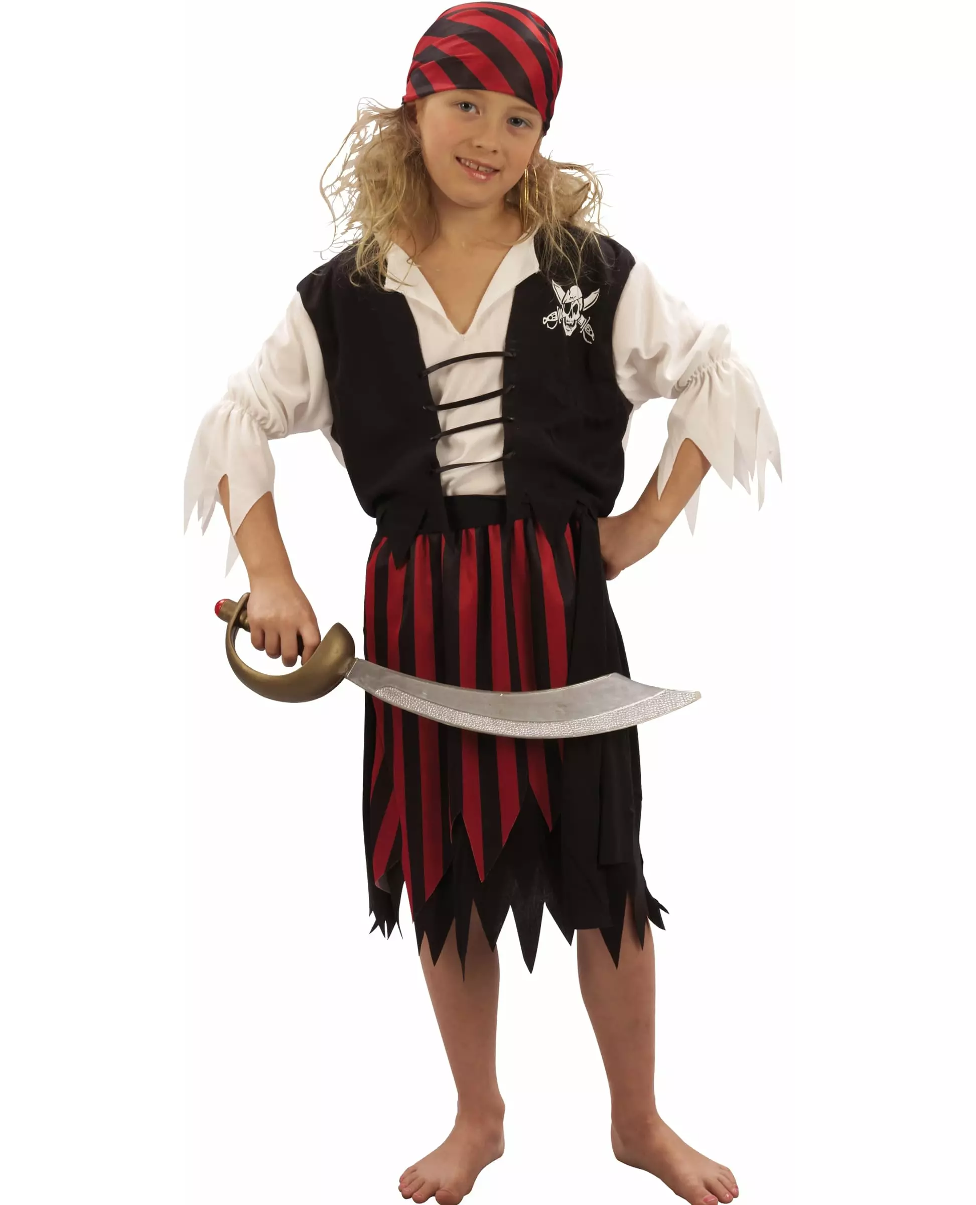 Stripete bandana inkludert! Dette piratkostymet for jenter består av en løs hvit skjorte med 3/4 kamskjellformede ermer og en integrert svart vest. En hvit hodeskalle er trykt på venstre side av brystet, og kragen er splittet (sabel ikke inkludert). Et rødt og svart stripete blondeskjørt, en matchende bandana og et svart belte fullfører dette kostymet, som vil være ideelt for karneval, et show eller andre utkledningsarrangementer. Inkludert tilbehør: Bandana Belte Skjorte med integrert vest Skjørt Materiale: 100 % polyester Vedlikehold: Renseri