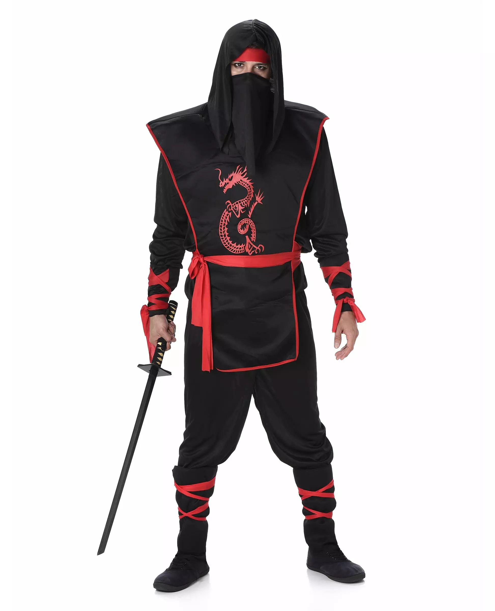 Bevæpn deg med nunchakuen din og gå i kamp! Dette kostymet består av en hettetopp, bukser, en tunika, et par mansjetter, et par leggbeskyttere, et rødt bånd og et skjerf (sabel og sko er ikke inkludert). Helt svart, hettetoppen og buksene er laget av et lett og luftig stoff for absolutt komfort! For å perfeksjonere antrekket, ta på deg den svarte tunikaen med røde detaljer! Den er laget av lett skum med en rød drage på brystet og holdes på plass bak med røde bånd! I tillegg er de to svarte mansjettene plassert på ermene på toppen og festet med røde bånd, akkurat som leggbeskytterne. Til slutt, for mer mystikk, knyt det svarte skjerfet rundt munnen og det røde båndet på pannen, ninjaantrekket! Et komplett ninjaantrekk for å imponere vennene dine under en kostymefest med kampsporttema! Inkludert tilbehør: Topp, bukser, tunika, bånd, par mansjetter, par leggbeskyttere. Materiale: 100 % polyester. Stell: Håndvask. Målinformasjon: Omtrentlige mål for størrelse M: hettegenser 73 cm, bukser 103 cm og tunika 82 cm.