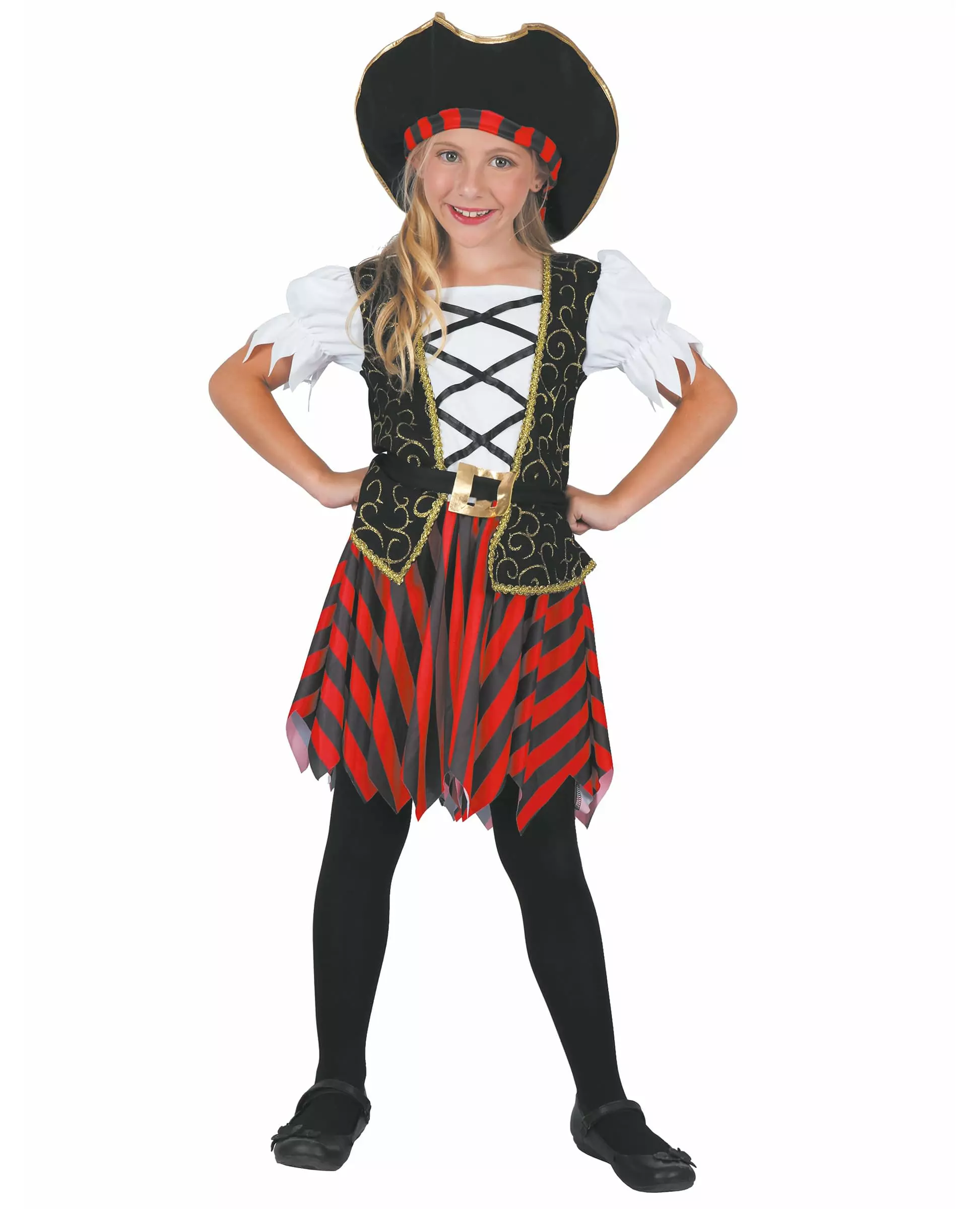Bli med på dette piratkostymet! Dette piratkostymet for jenter består av en kjole, et belte og en hatt (strømpebukser og sko er ikke inkludert). Kjolen er hvit overdel med en svart og gullfarget fuskevest. Svart fuskesnøring er også på forsiden. Kjolen er kuttet i spisser underdeler. Den har svarte og røde striper. Stoffbeltet er svart med en gullfarget stoffspenne. Til slutt fullfører en pirathatt kostymet. Det er svart med en gullkant. Et svart og rødt stripete pannebånd er også rundt hodet. Dette piratkostymet vil være perfekt til karneval eller en temabursdagsfest. Inkludert tilbehør: Kjole Belte Hatt Materiale: 100 % polyester Vedlikehold: Håndvask