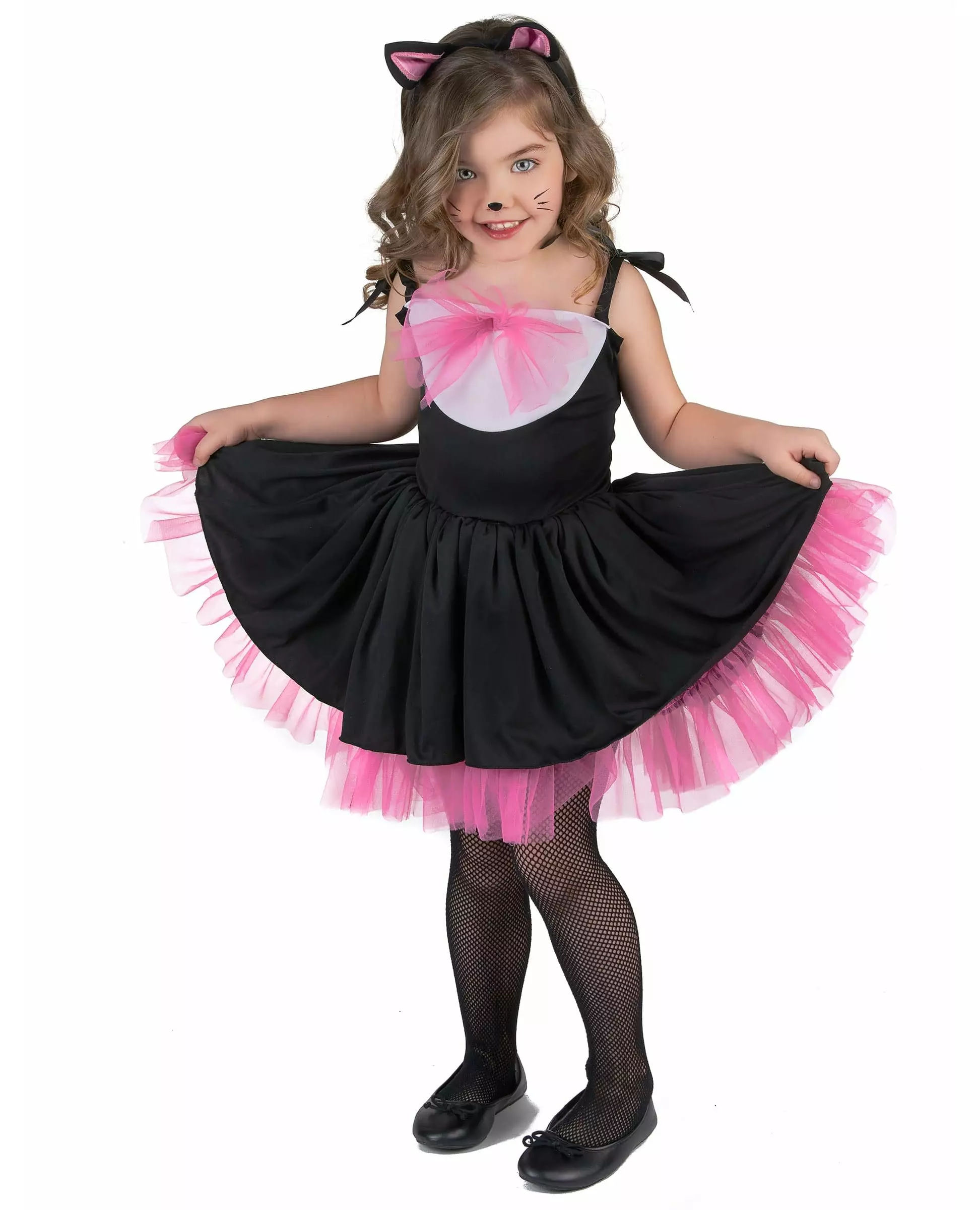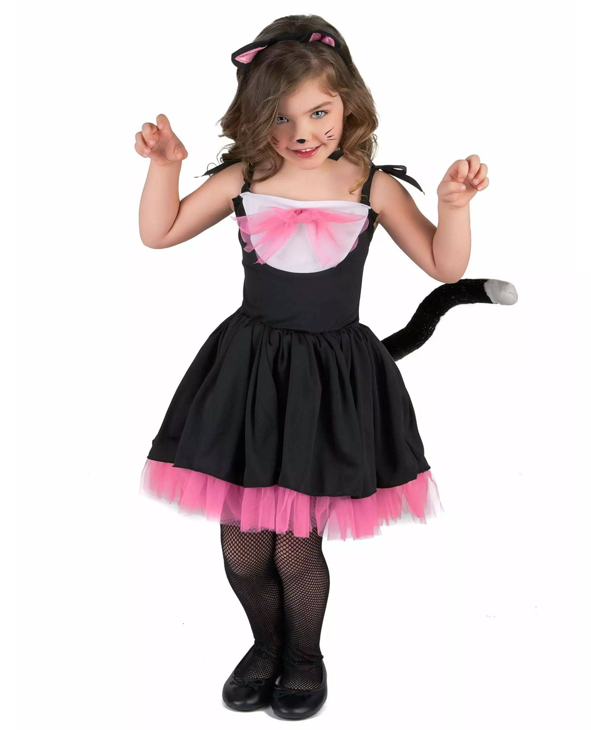 Lille Operakatt Dette kattekostymet for jenter inkluderer en kjole og et pannebånd (strømpebukser og sko er ikke inkludert). Kjolen er svart med tynne elastiske stropper. Trang ved bysten, den blusser ut fra livet. Denne kjolen vil være full av volum for best å fremkalle en tutu. Rosa tyll er også tilstede nederst på kjolen og øverst på bysten. Hva ville et kattekostyme være uten hale? Det er sydd til kjolen og dekket med skinnende svart og sølvfarget syntetisk hår. Pannebåndet er svart og toppet med to små svarte ører, også med en lyserosa innside. Det vil pryde datterens hode på en nydelig måte.     Dette kostymet, verdig en spirende liten danser, vil være ideelt for karneval eller for et show på slutten av året.  . Inkludert tilbehør: Kjolepannebånd Materiale: 100 % polyester Stell: Håndvaskbar