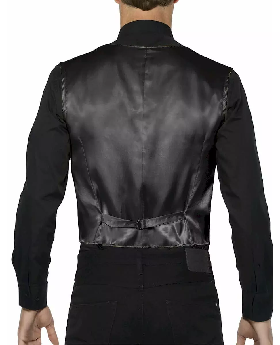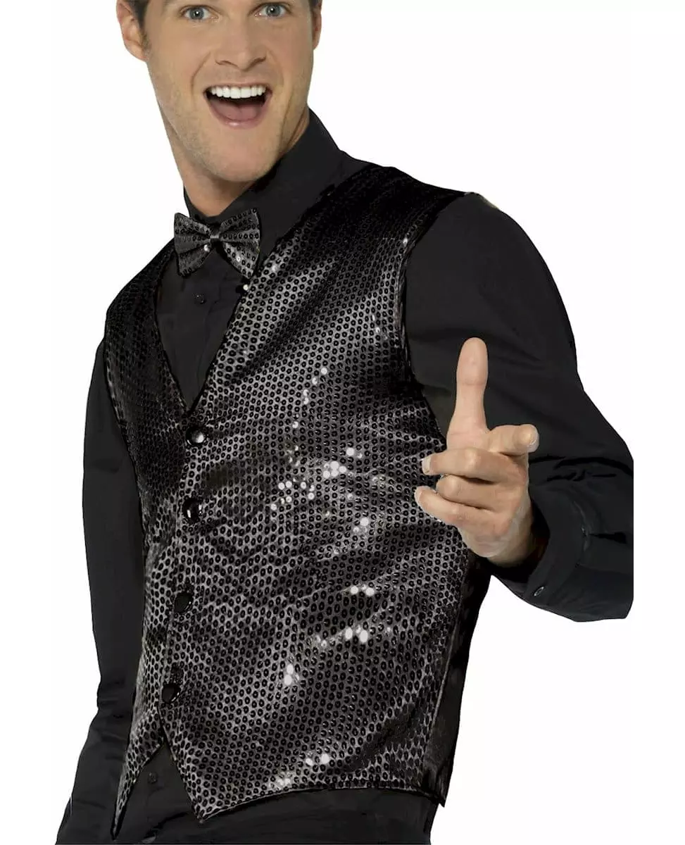 Genialt! Denne svarte paljettvesten er for voksne (kun vesten er inkludert). Den har paljetter foran, og ryggen er laget av svart satengstoff. Vesten lukkes med fire knapper foran. Den har også to knytebånd bak, slik at den kan knytes igjen. Denne vesten vil være perfekt for å fullføre et kostyme til et diskotek eller en Charleston-fest. Inkludert tilbehør: vest, Materiale: 100 % polyester,