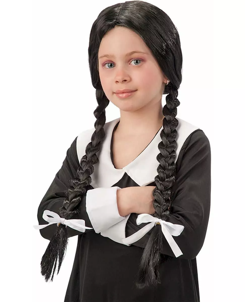 Forvandle Addams-familien med denne parykken! Denne skolejenteparykken for jenter er laget av svart syntetisk hår. Den danner to lange fletter lukket med en hvit sløyfe. Denne parykken vil være perfekt for å fullføre et Addams-familiekostyme på onsdagskvelden på Halloween. Inkludert tilbehør: Parykk Materiale: Polyester