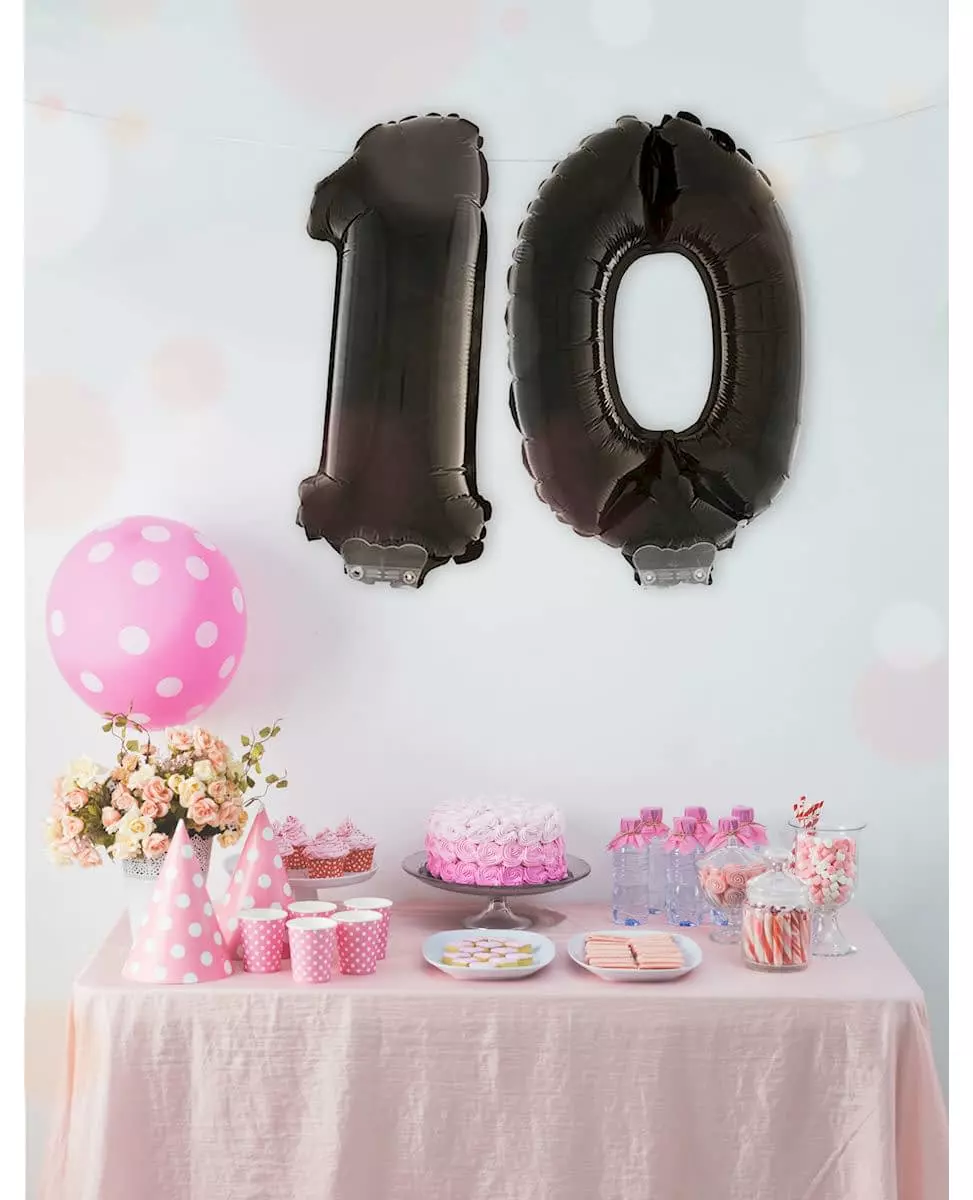 En tallballong for en elegant dekorasjon! Denne svarte tallballongen i aluminium måler omtrent 1 meter høy. Du kan velge mellom tall fra 0 til 9. Du kan blåse den opp med helium eller luft ved hjelp av et sugerør (ikke inkludert) som du kan sette inn i den medfølgende ventilen. Du kan enten henge den opp med et bånd som du bare fører gjennom maljene på ballongen, eller feste den til en vekt slik at den svever i luften. Denne gigantiske tallballongen vil være ideell for en elegant dekorasjon til en bursdag, et bryllup eller til nyttår! Inkludert tilbehør: 1 tallballong Materiale: Aluminium