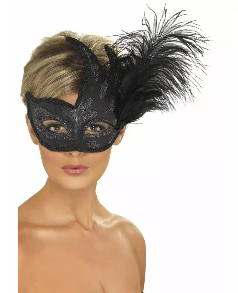 Veldig pen formet ulv med vakre fjær og brodert kant rundt kanten! Denne svarte ulven med sølvpaljetter og fjær er overdådig. Den er dekorert rundt kanten med en brodert kant, og formen er veldig original. To svarte bånd lar deg feste den til hodet, og to filtklistremerker er plassert ved tinningene for å sikre komfort og beskyttelse. Dette tilbehøret vil være ideelt hvis du ønsker å kombinere eleganse og mystikk under et maskerte ball eller en kostymefest.