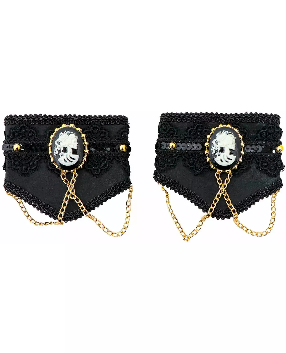 Uunnværlig for et gotisk antrekk! Dette paret med gotiske mansjetter er for voksne. De er helt svarte og dekorert med barokke mønstre og en hvit medaljong i midten. I tillegg flettes to gullkjeder sammen fra medaljongen. Våg å bruke gotiske mansjetter for å fullføre Halloween-kostymet ditt! Inkludert tilbehør: Par med mansjetter